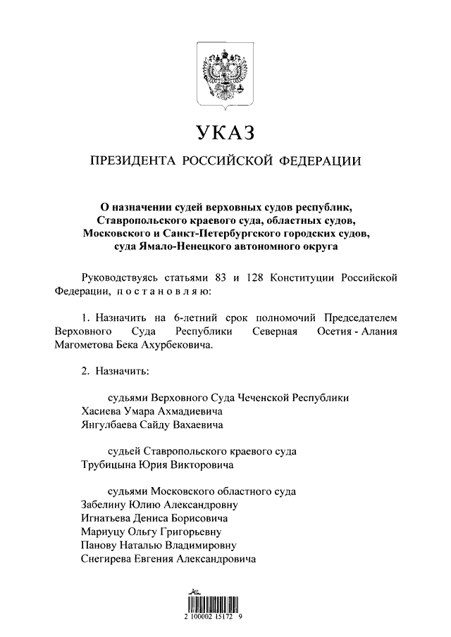 "О назначении судей верховных судов республик, Ставропольского краевого суда, областных судов, Московского и Санкт-Петербургского городских судов, суда Ямало-Ненецкого автономного округа"