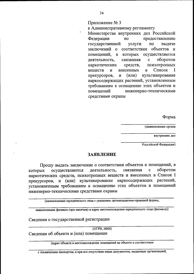 "Об утверждении Административного регламента Министерства внутренних дел Российской Федерации по предоставлению государственной услуги по выдаче заключений о соответствии объектов и помещений, в которых осуществляются деятельность, связанная с оборотом наркотических средств, психотропных веществ и внесенных в Список 1 прекурсоров, и (или) культивирование наркосодержащих растений, установленным требованиям к оснащению этих объектов и помещений инженерно-техническими средствами охраны"