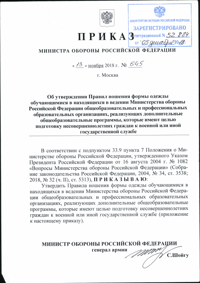 Приказ Министра обороны Российской Федерации от 13.11.2018 № 645