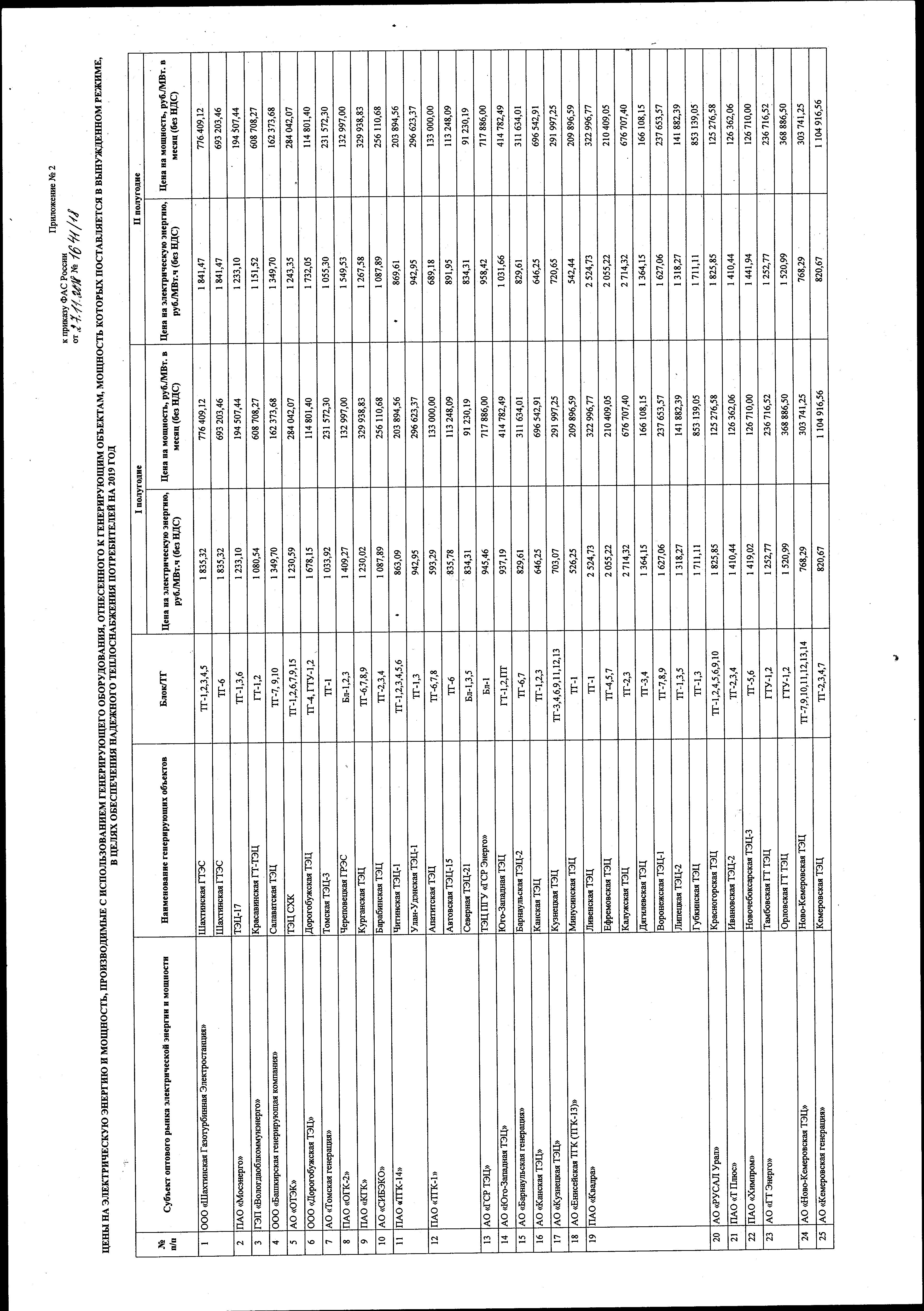 "Об утверждении цен на электрическую энергию и мощность, производимые с использованием генерирующих объектов, поставляющих мощность в вынужденном режиме, на 2019 под"