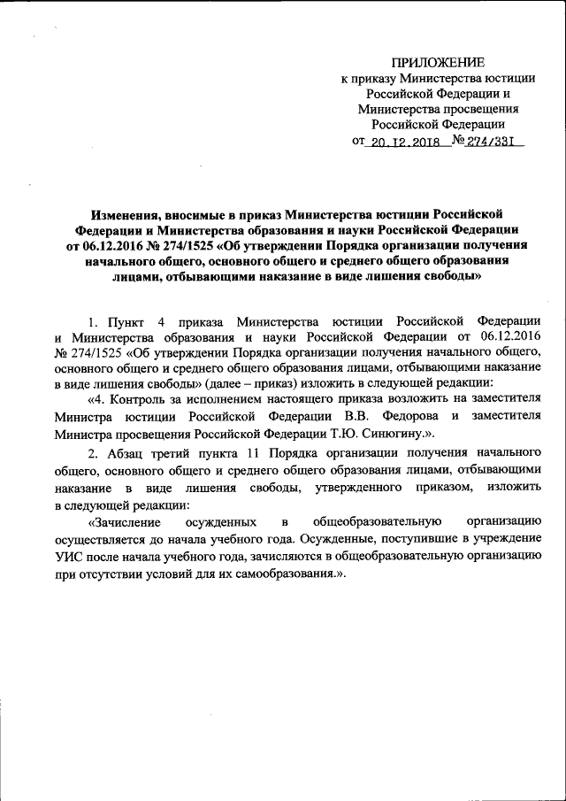 "О внесении изменений в приказ Министерства юстиции Российской Федерации и Министерства образования и науки Российской Федерации от 06.12.2016 № 274/ 1525 "Об утверждении Порядка организации получения начального общего, основного общего и среднего общего образования лицами, отбывающими наказание в виде лишения свободы"