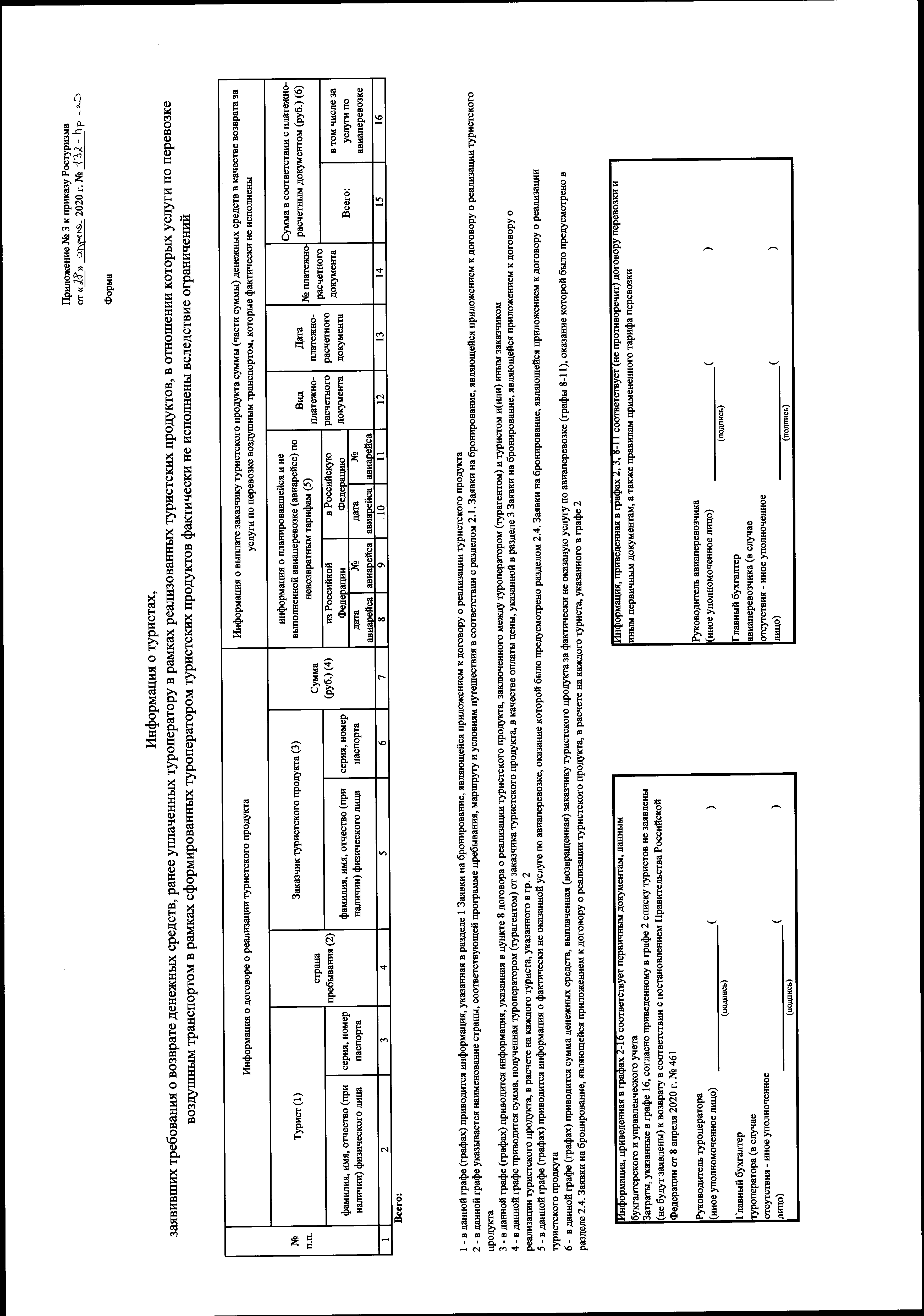 "Об утверждении формы и состава заявки о предоставлении в 2020 году субсидий из федерального бюджета туроператорам на возмещение затрат, понесенных при выполнении мероприятий, связанных с ограничениями, вызванными распространением новой коронавирусной инфекции, формы представления информации о туристах, заявивших требования о возврате денежных средств, ранее уплаченных туроператору в рамках реализованных туристских продуктов, в отношении которых услуги по перевозке воздушным транспортом в рамках сформированных туроператором туристских продуктов фактически не исполнены вследствие ограничений"