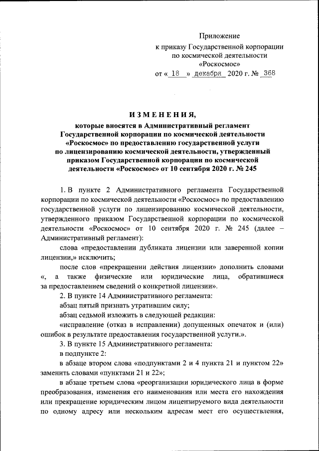 Приказ Государственной корпорации по космической деятельности "Роскосмос" от 18.12.2020 № 368