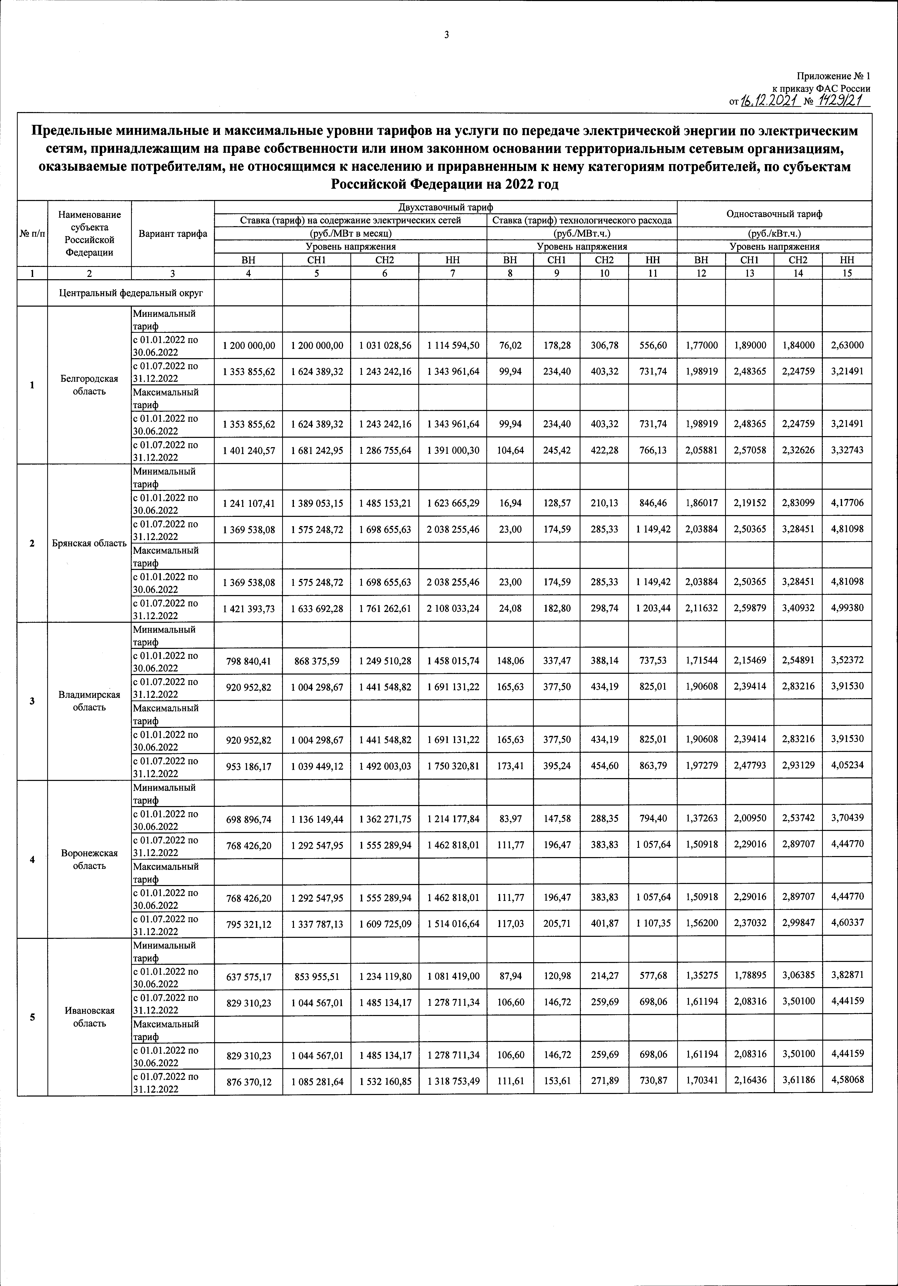 "Об утверждении предельных минимальных и максимальных уровней тарифов на услуги по передаче электрической энергии по электрическим сетям, принадлежащим на праве собственности или ином законном основании территориальным сетевым организациям, оказываемые потребителям, не относящимся к населению и приравненным к нему категориям потребителей, по субъектам Российской Федерации на 2022 год"