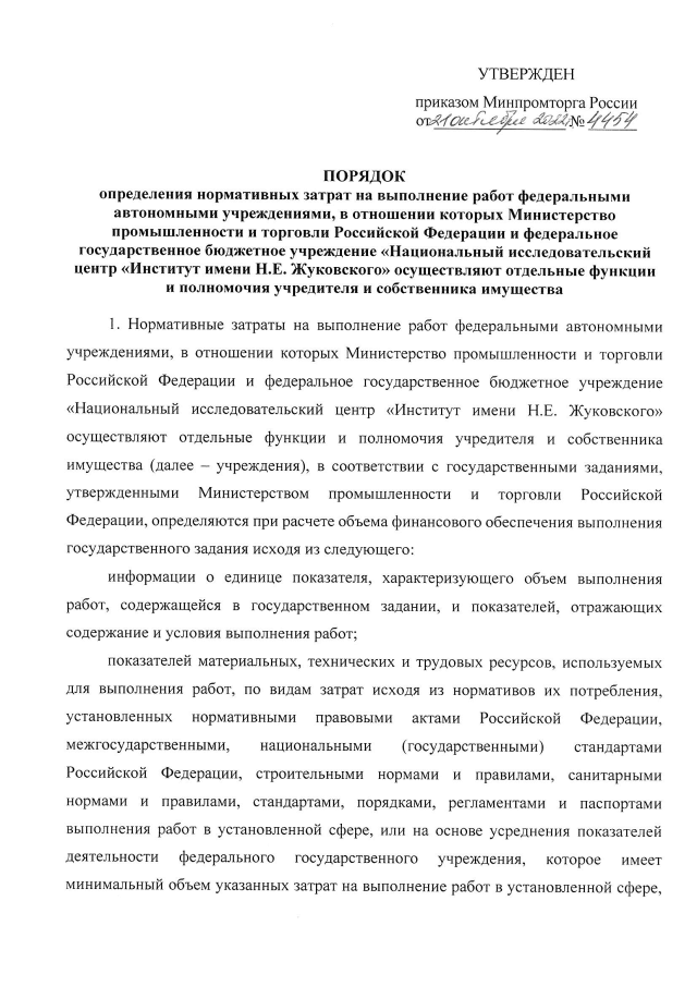 "Об утверждении Порядка определения нормативных затрат на выполнение работ федеральными автономными учреждениями, в отношении которых Министерство промышленности и торговли Российской Федерации и федеральное государственное бюджетное учреждение "Национальный исследовательский центр "Институт имени Н.Е. Жуковского" осуществляют отдельные функции и полномочия учредителя и собственника имущества"