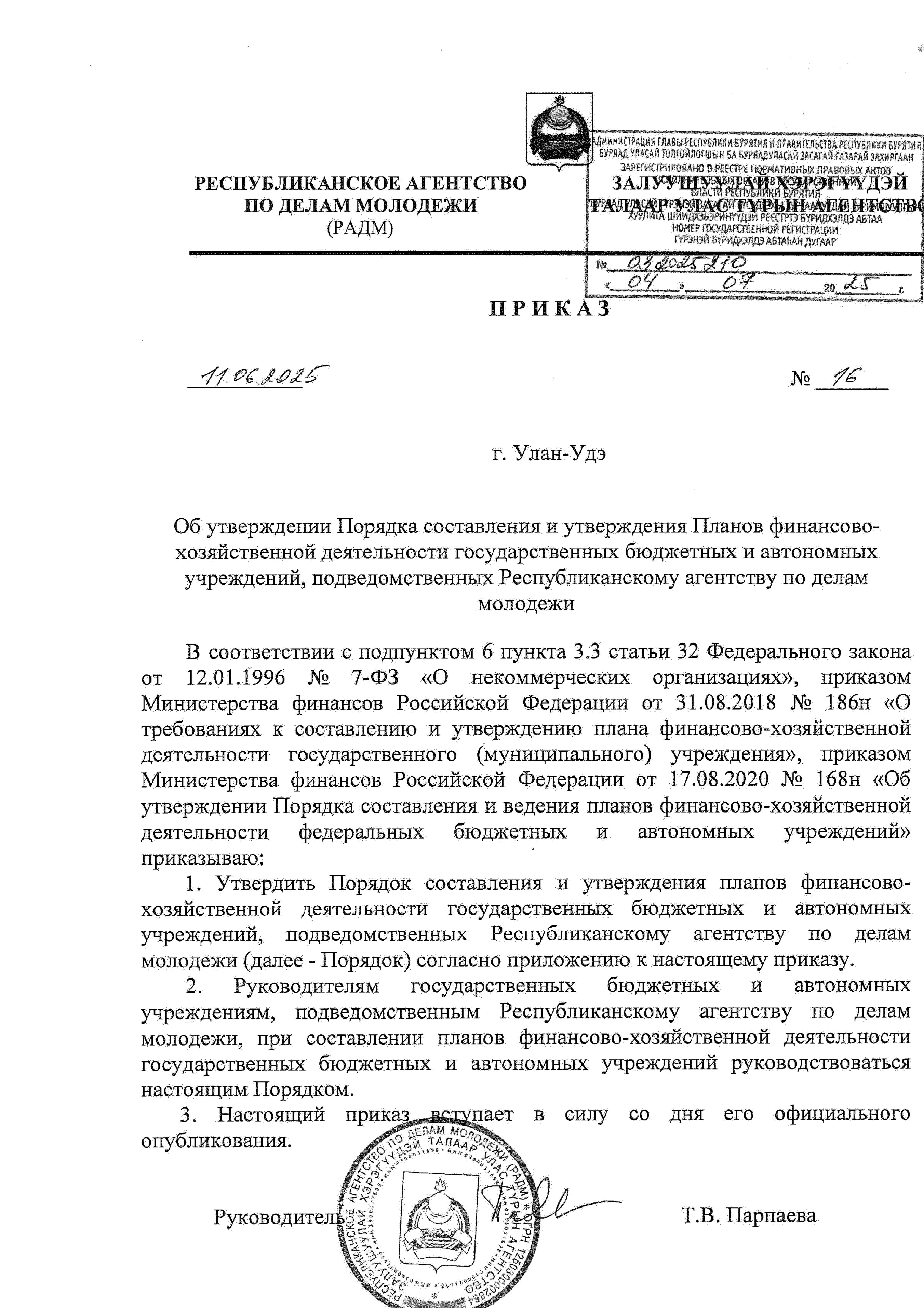 Приказ Республиканского агентства по делам молодежи Республики Бурятия от 11.06.2025 № 16