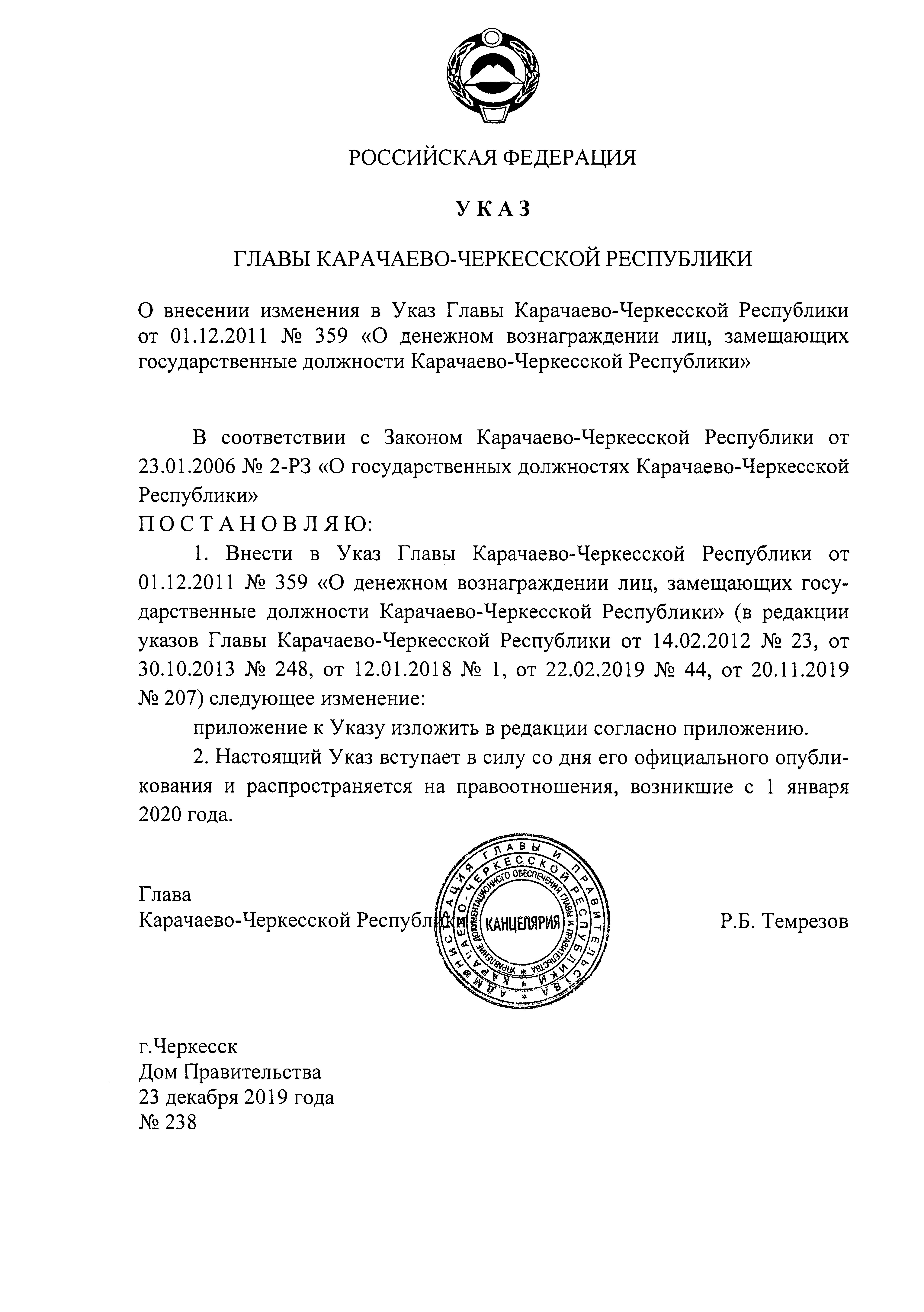 Указ Главы Карачаево-Черкесской Республики от 23.12.2019 № 238
