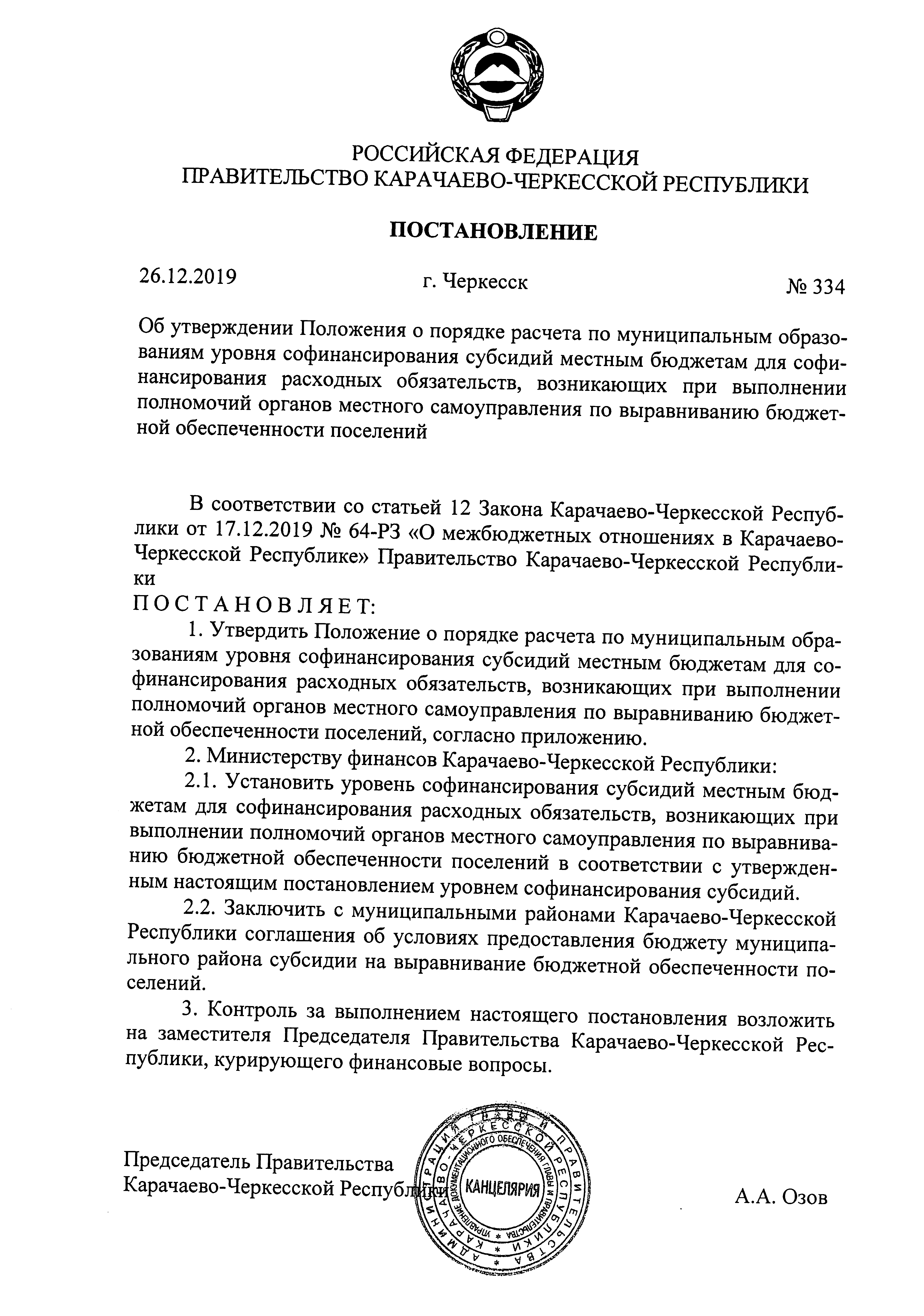 Постановление Правительства Карачаево-Черкесской Республики от 26.12.2019 № 334