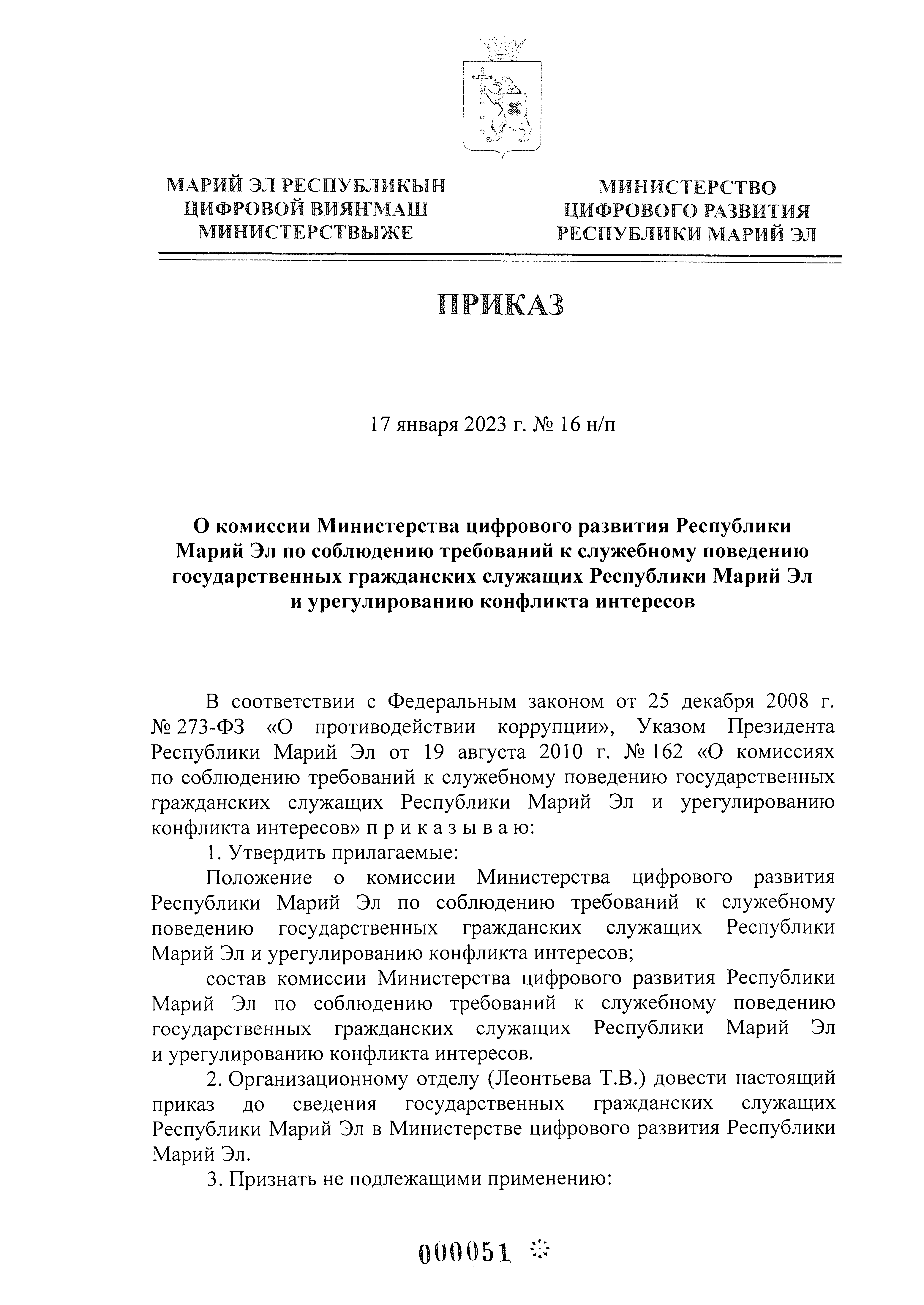 Приказ Министерства цифрового развития Республики Марий Эл от 17.01.2023 № 16 н/п