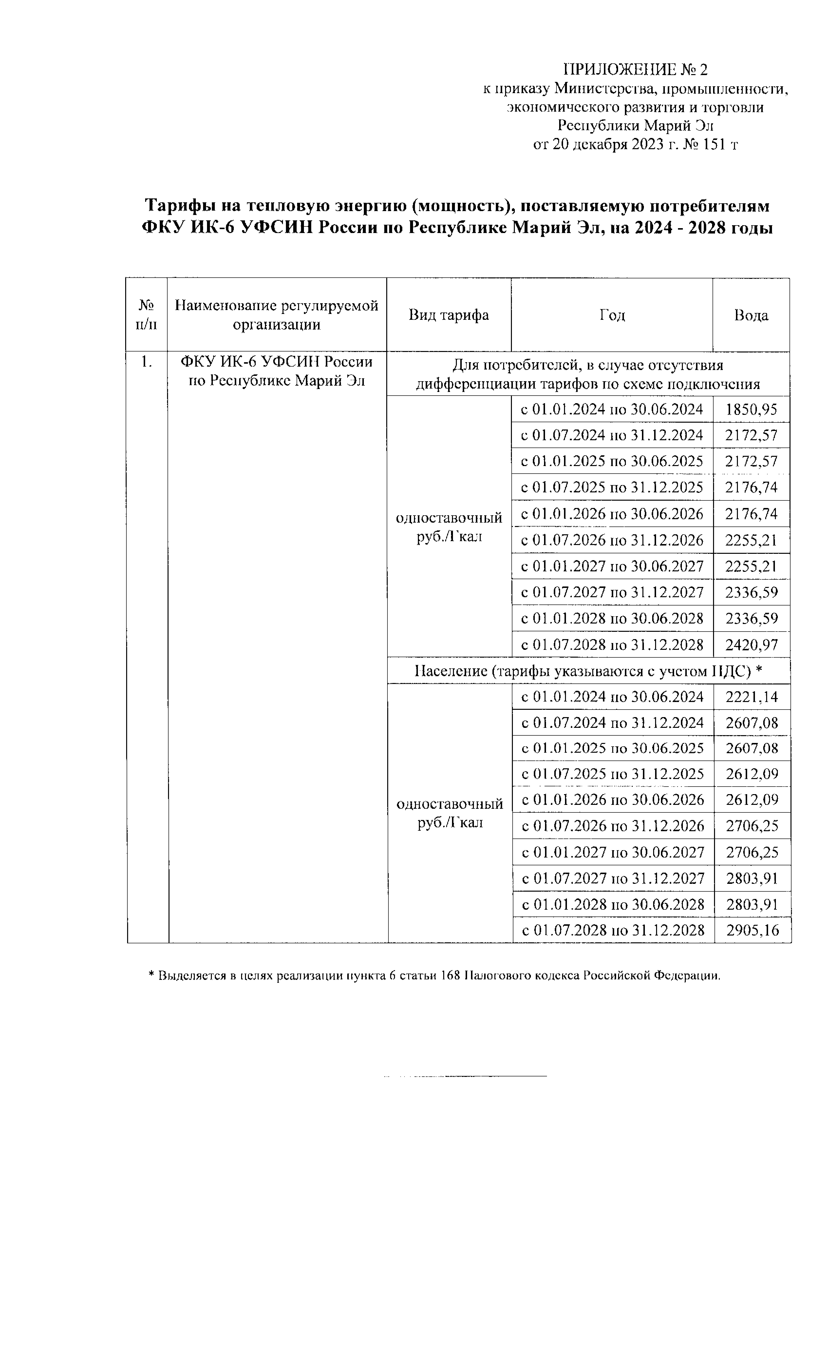 "Об установлении тарифов на тепловую энергию (мощность), поставляемую потребителям ФКУ ИК-6 УФСИН России по Республике Марий Эл, на 2024 - 2028 годы"