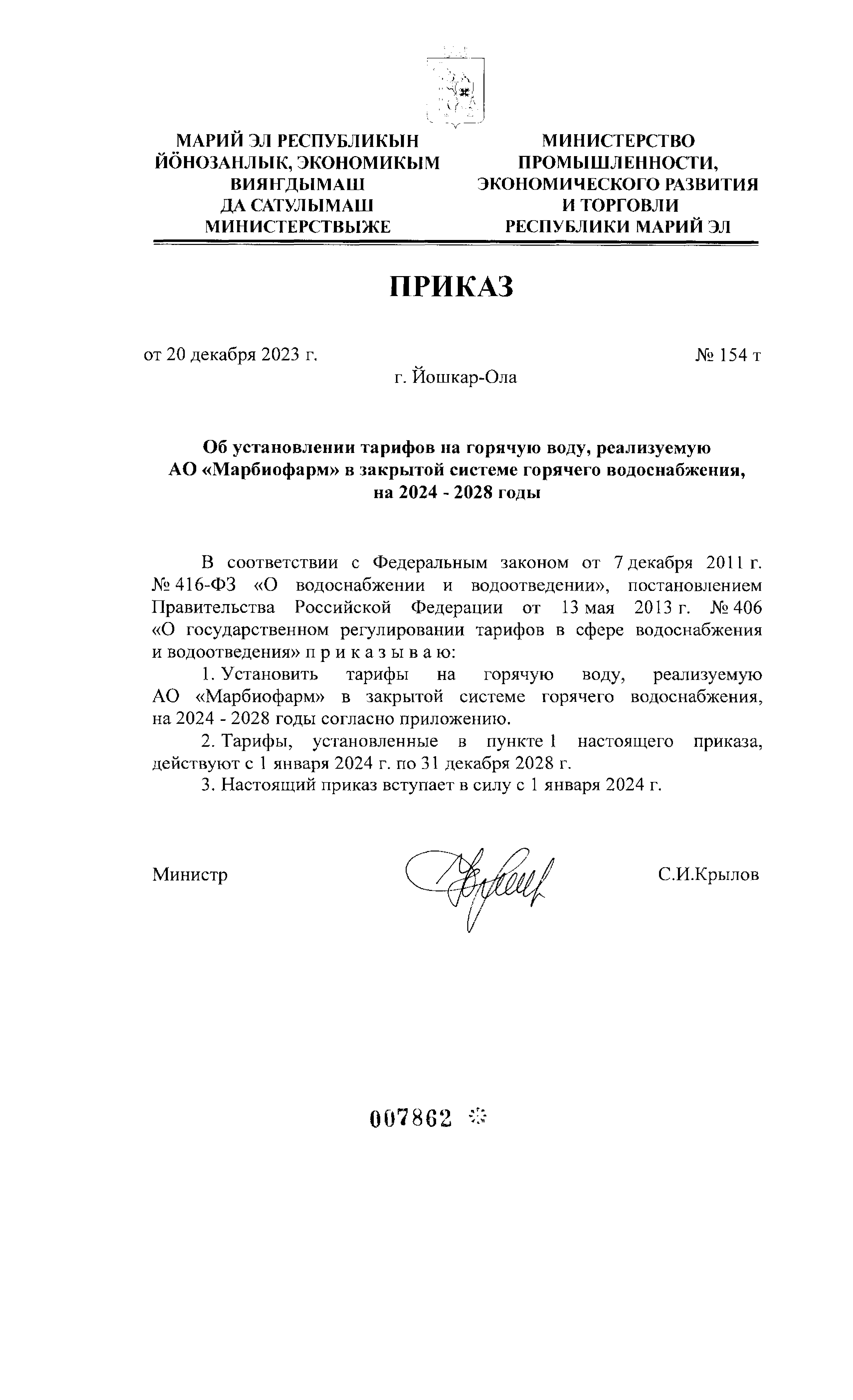 Приказ Министерства промышленности, экономического развития и торговли Республики Марий Эл от 20.12.2023 № 154 т