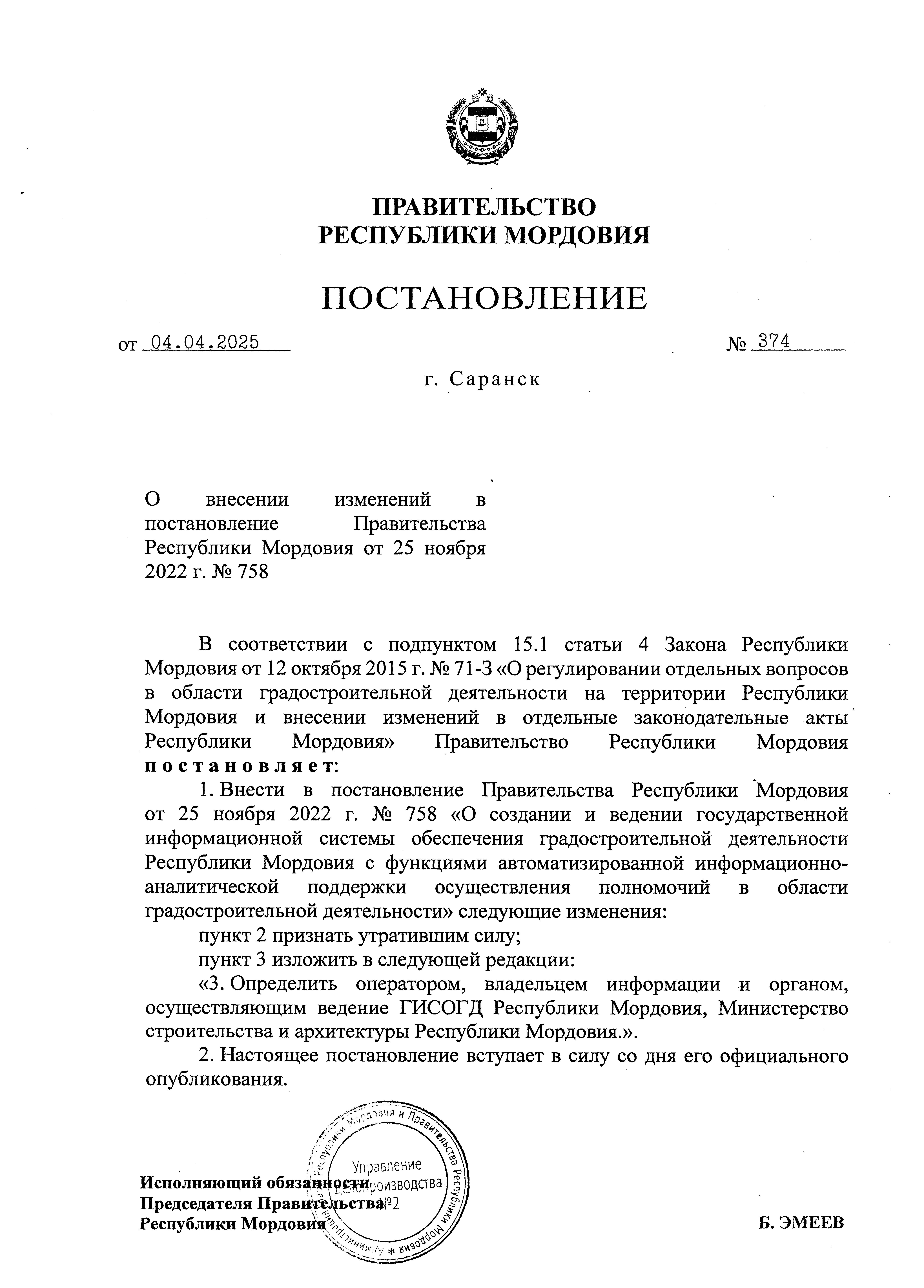 Постановление Правительства Республики Мордовия от 04.04.2025 № 374