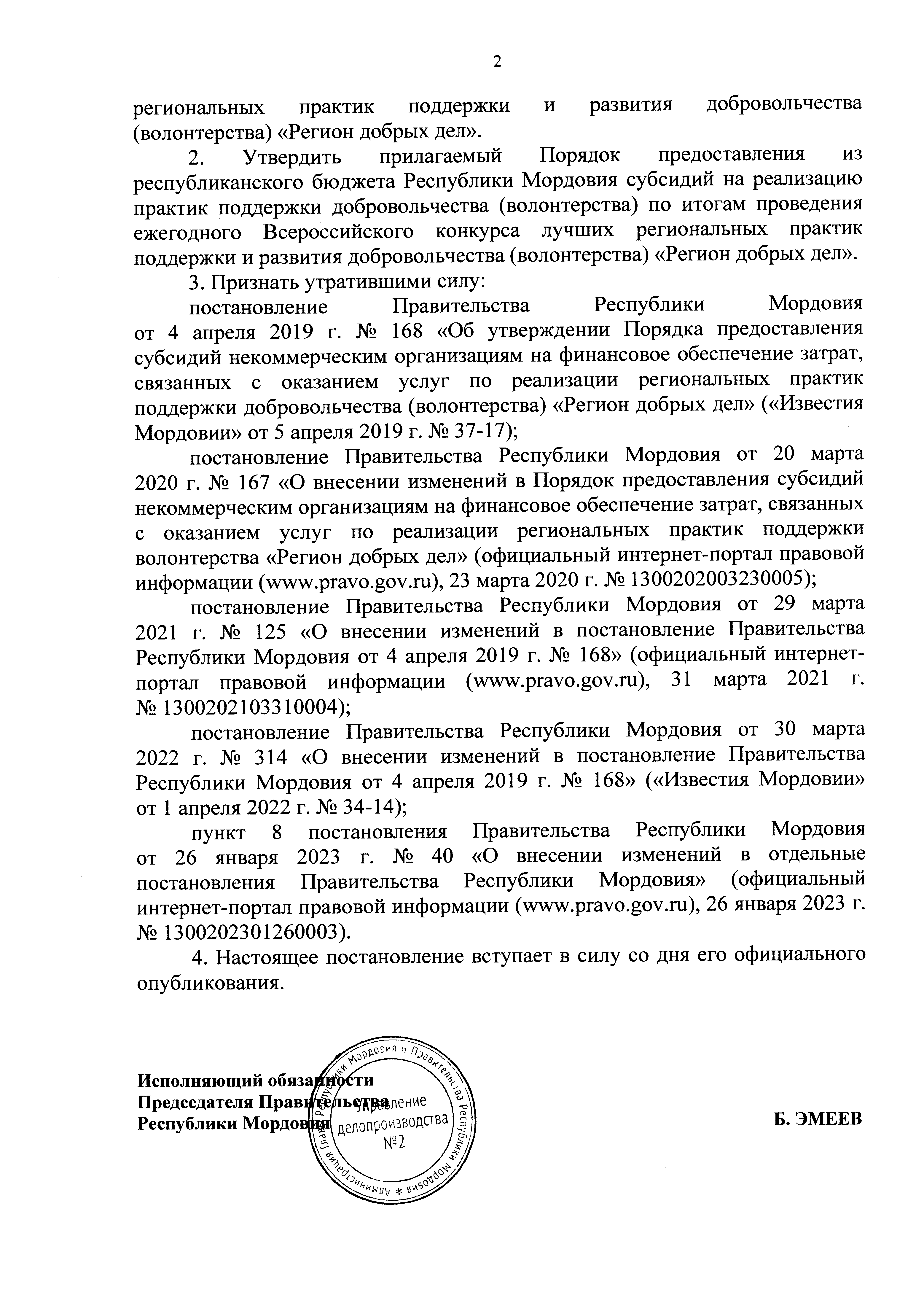 "Об установлении расходного обязательства Республики Мордовия и утверждении Порядка предоставления из республиканского бюджета Республики Мордовия субсидий на реализацию практик поддержки добровольчества (волонтерства) по итогам проведения ежегодного Всероссийского конкурса лучших региональных практик поддержки и развития добровольчества (волонтерства) "Регион добрых дел" и признании утратившими силу отдельных постановлений Правительства Республики Мордовия"