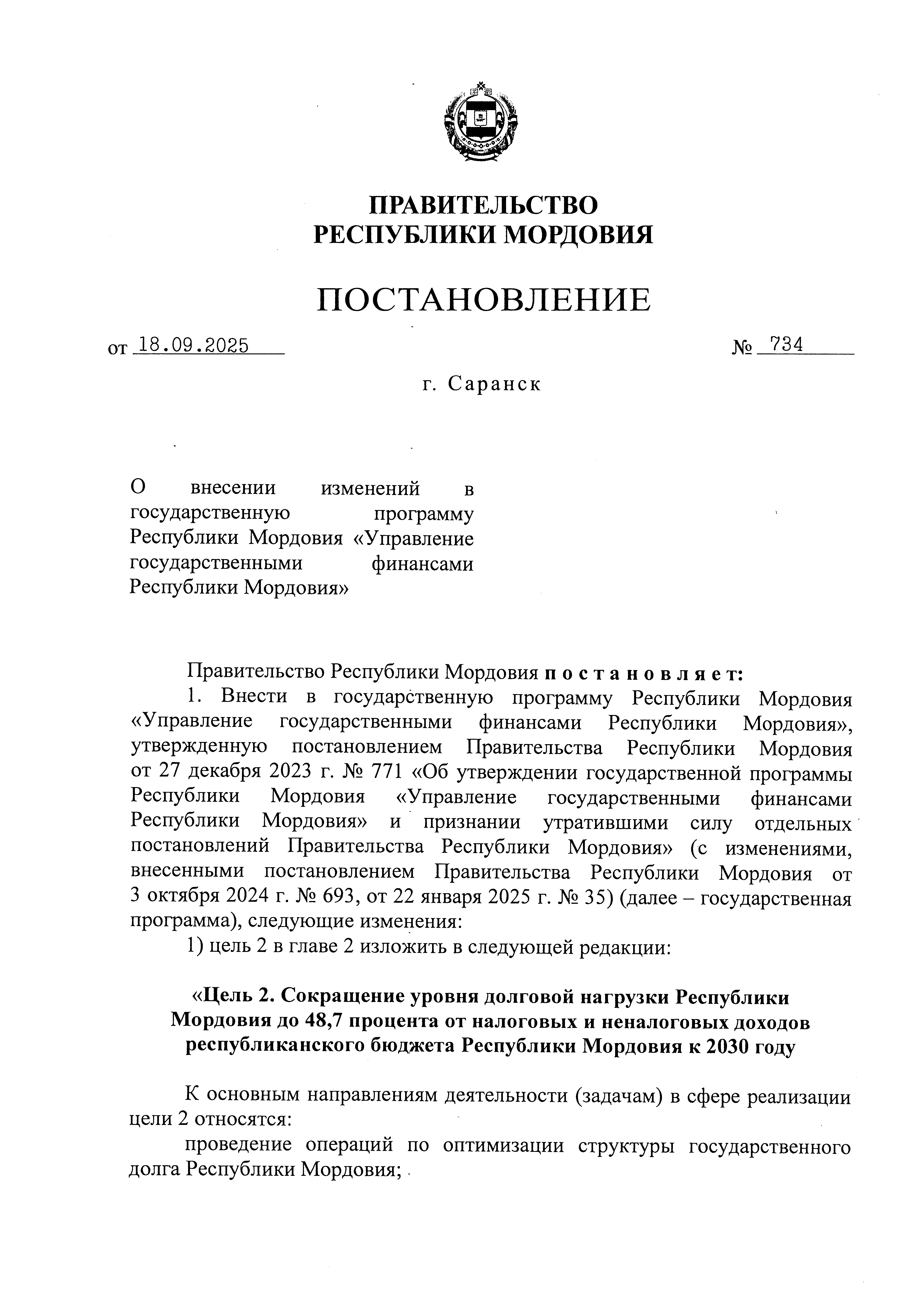 Постановление Правительства Республики Мордовия от 18.09.2025 № 734