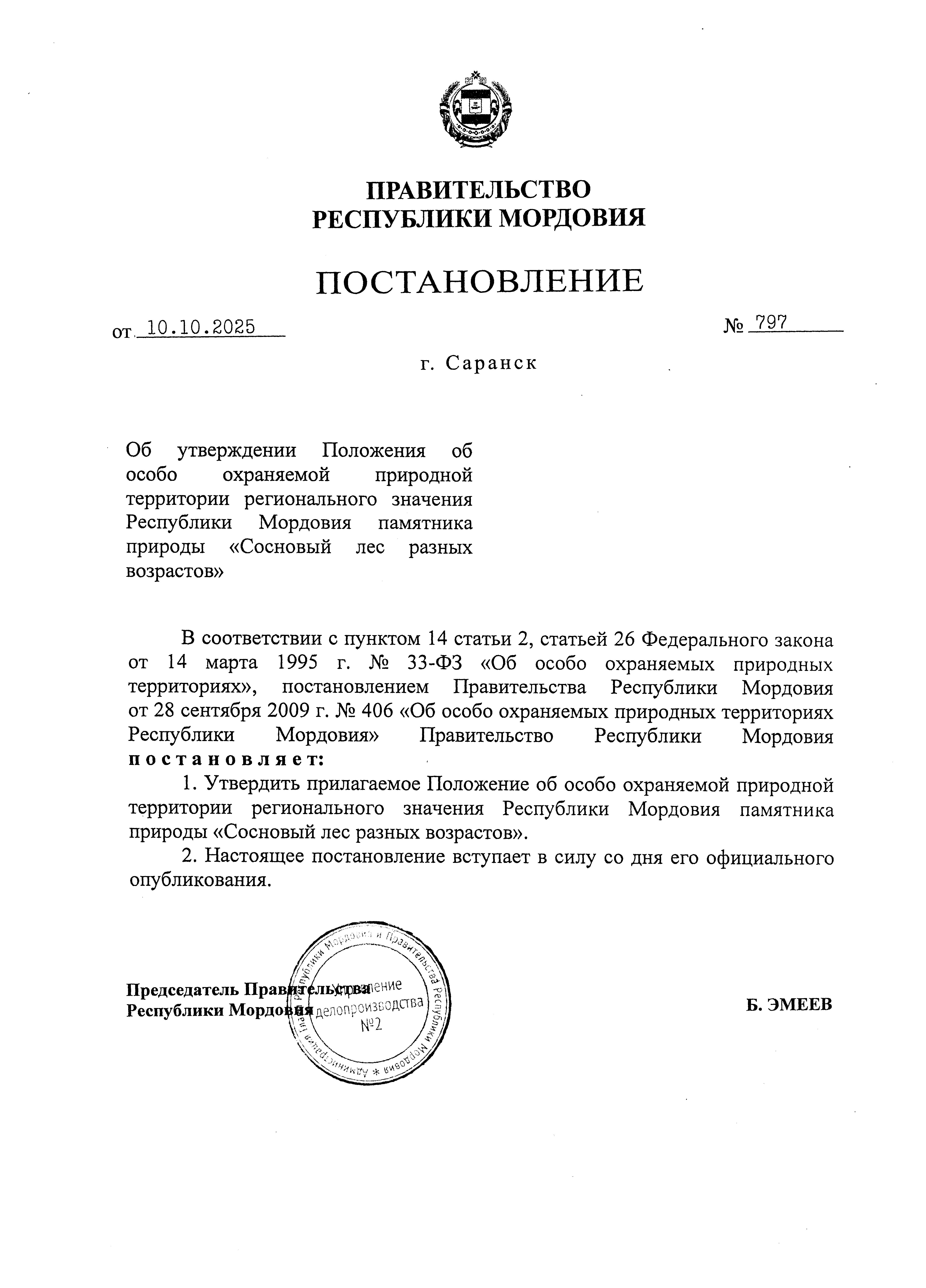 Постановление Правительства Республики Мордовия от 10.10.2025 № 797