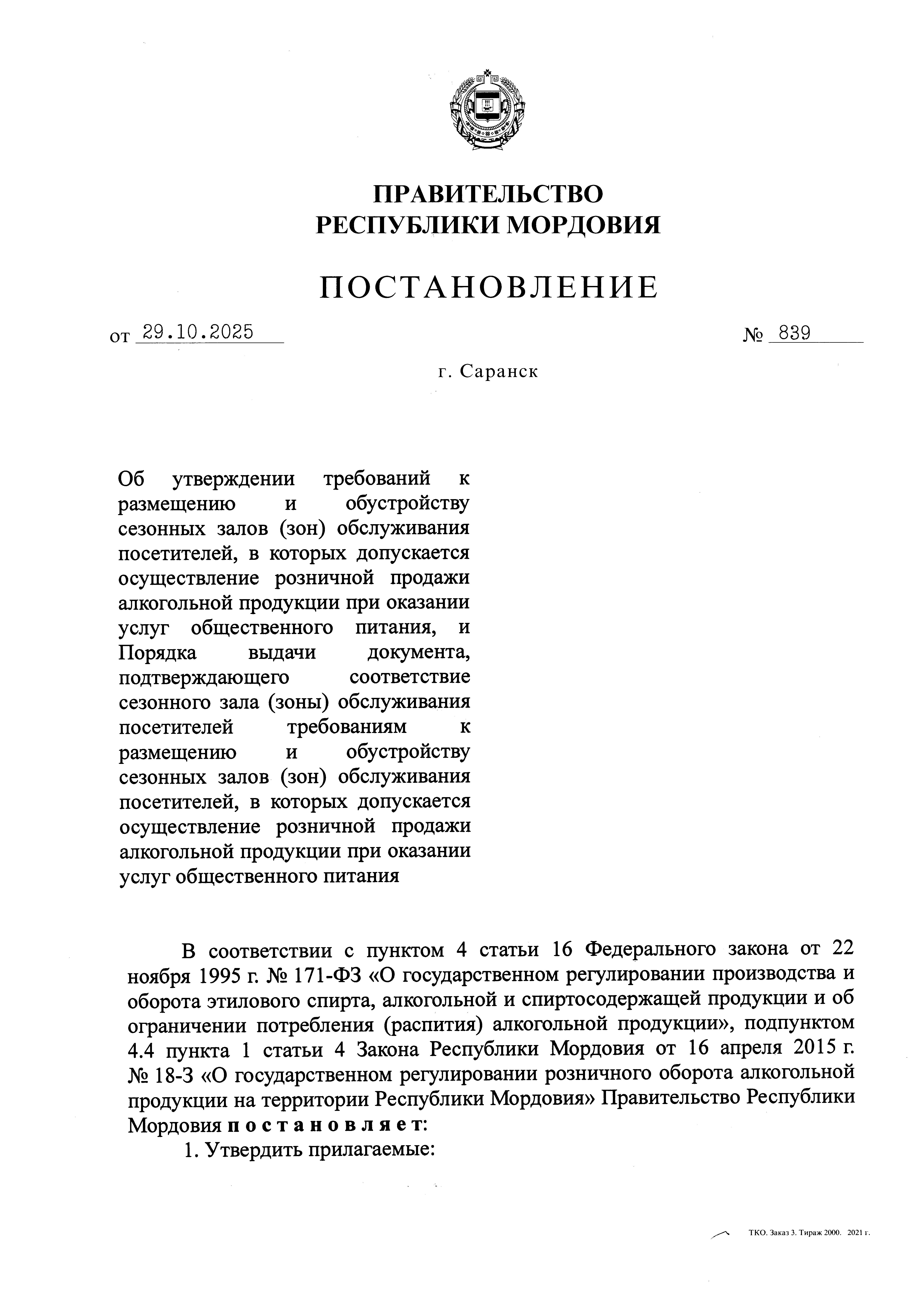 Постановление Правительства Республики Мордовия от 29.10.2025 № 839