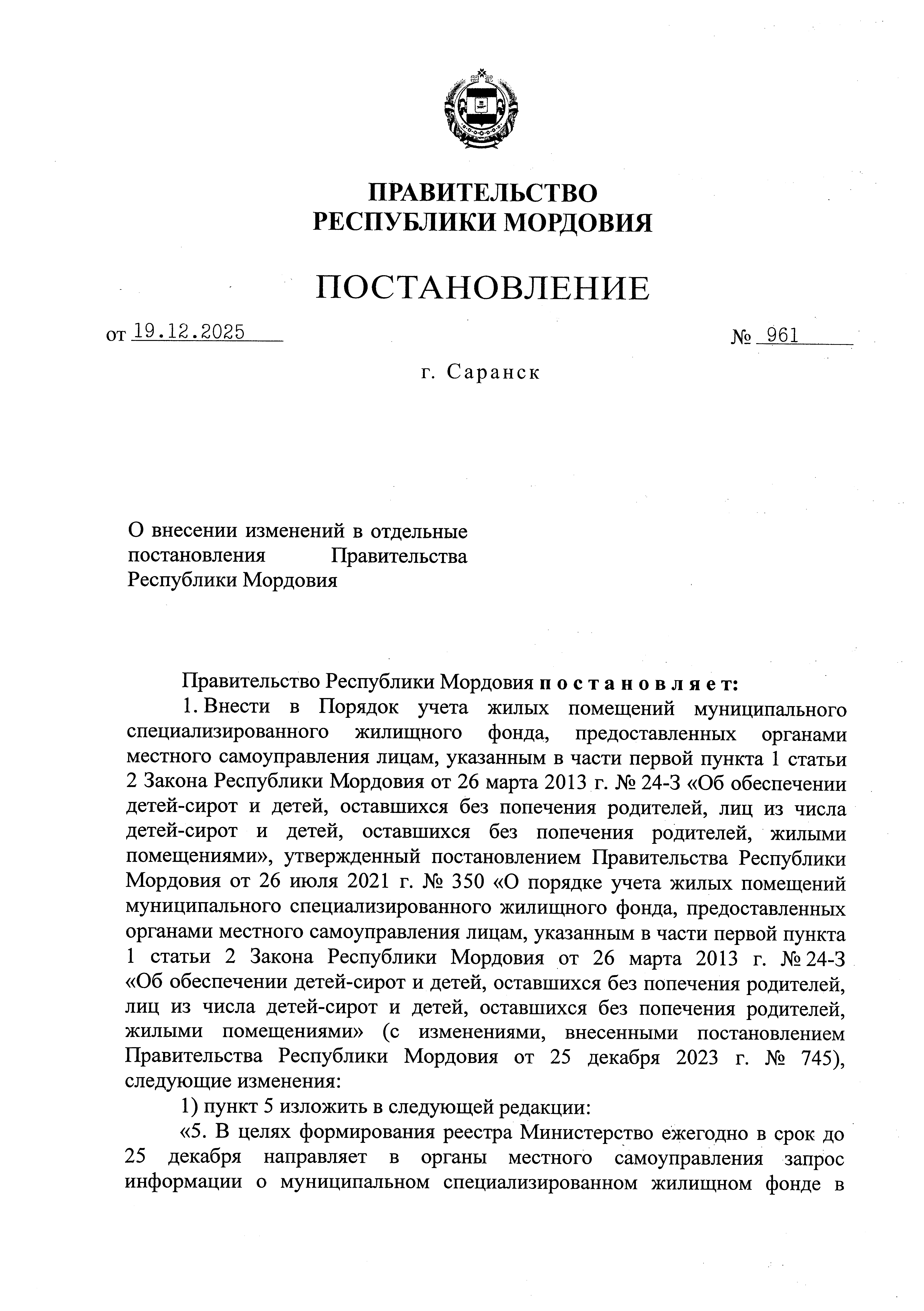 Постановление Правительства Республики Мордовия от 19.12.2025 № 961