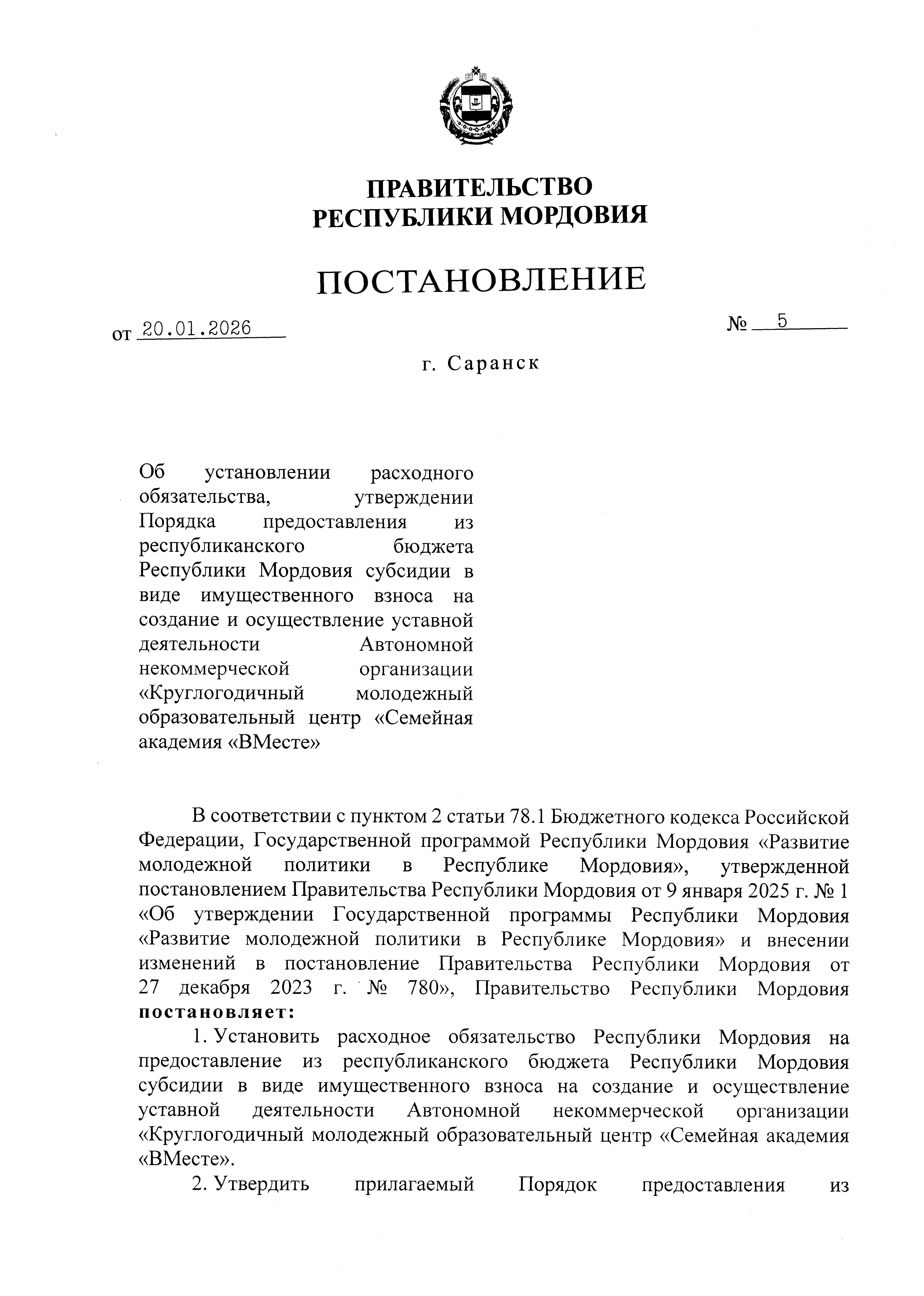 Постановление Правительства Республики Мордовия от 20.01.2026 № 5