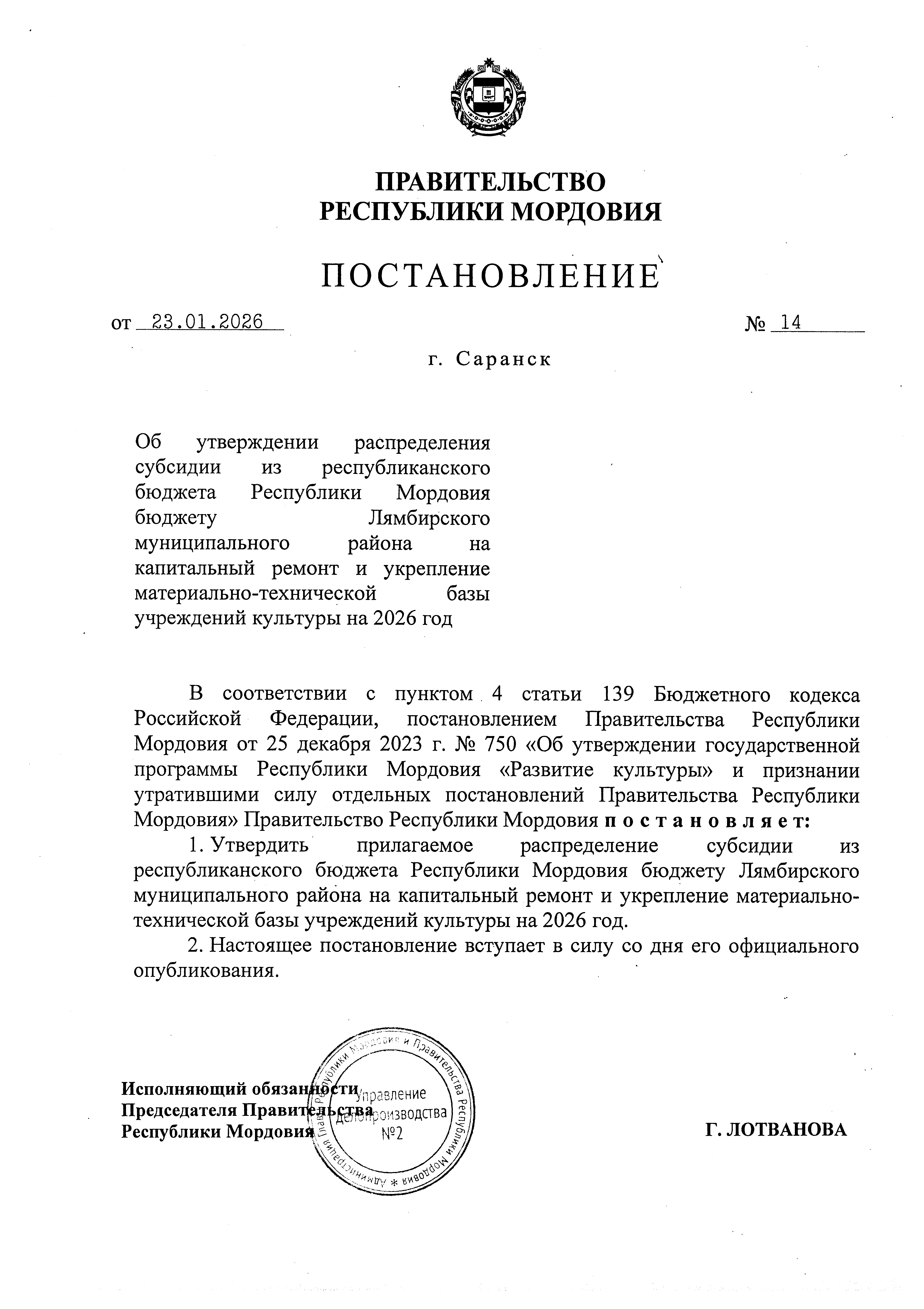 Постановление Правительства Республики Мордовия от 23.01.2026 № 14