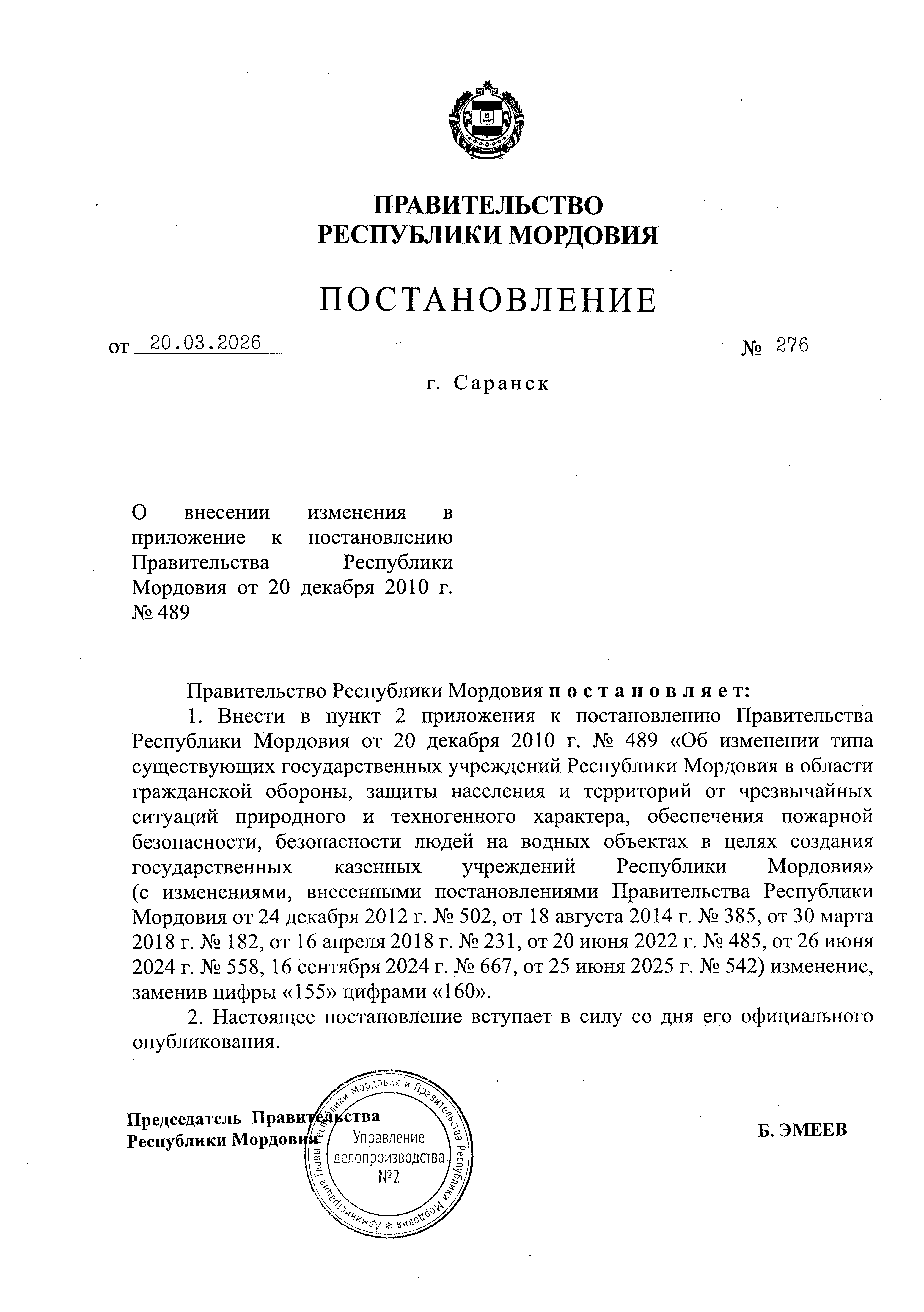 Постановление Правительства Республики Мордовия от 20.03.2026 № 276