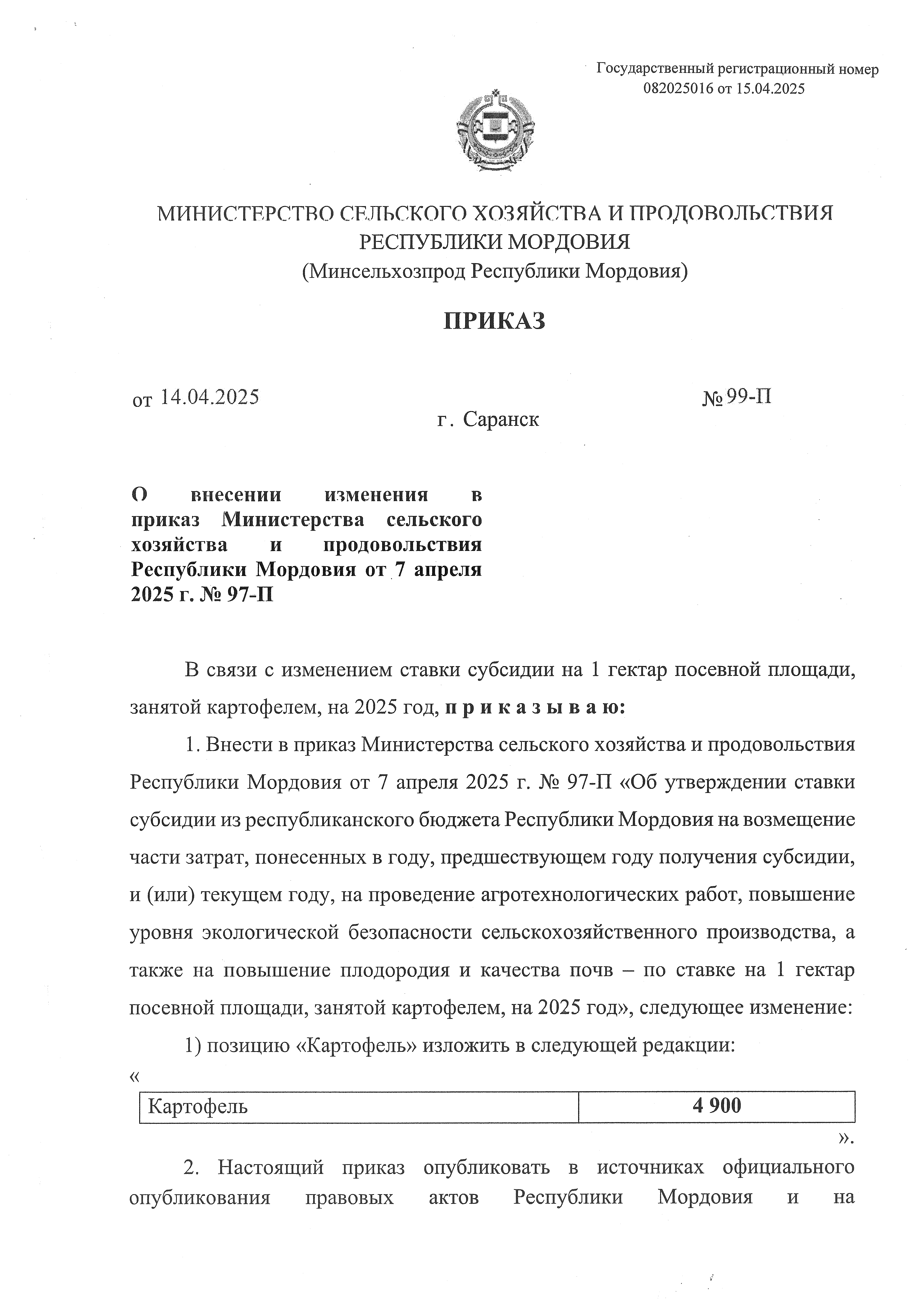 Приказ Министерства сельского хозяйства и продовольствия Республики Мордовия от 14.04.2025 № 99-П