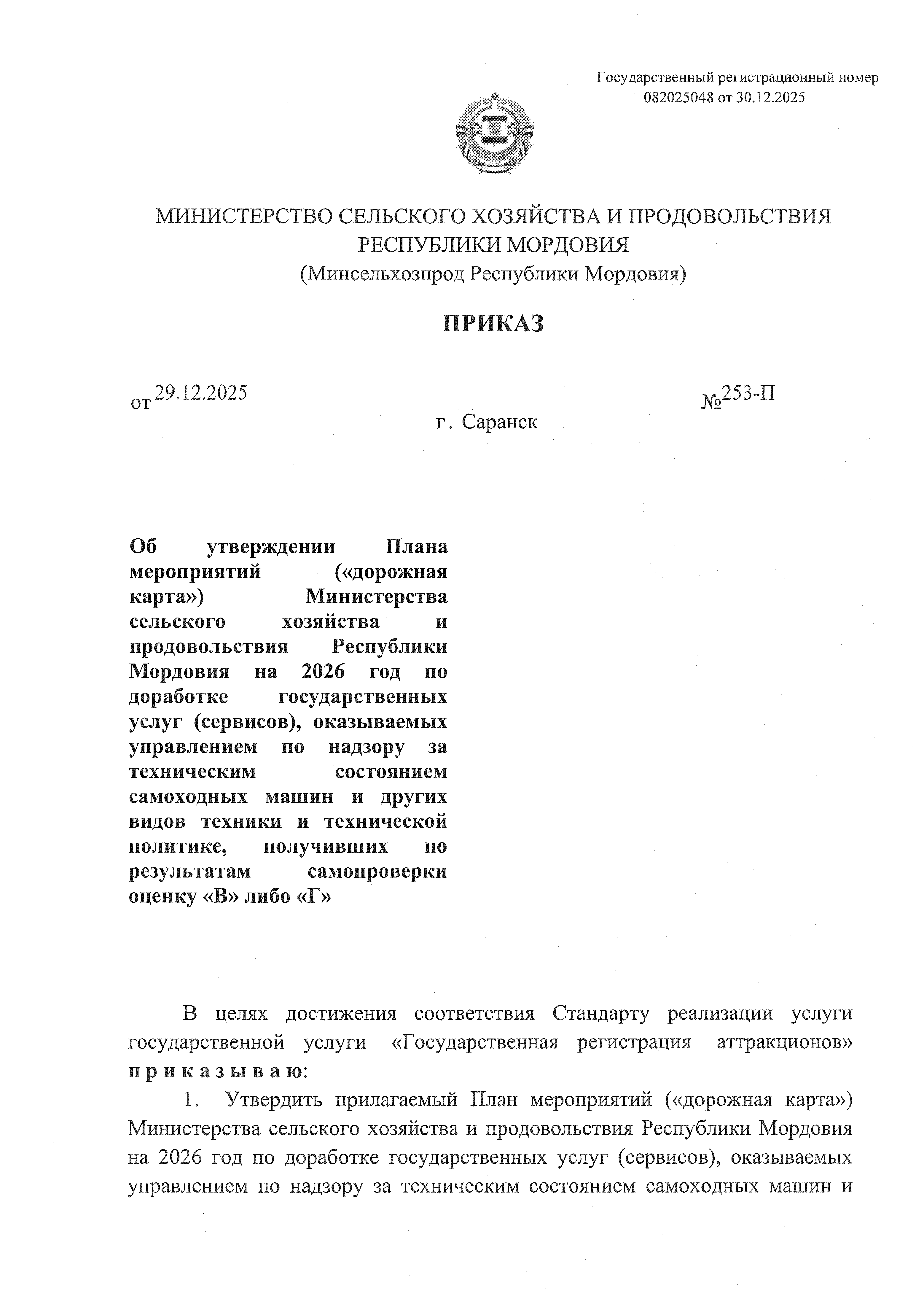 Приказ Министерства сельского хозяйства и продовольствия Республики Мордовия от 29.12.2025 № 253-П