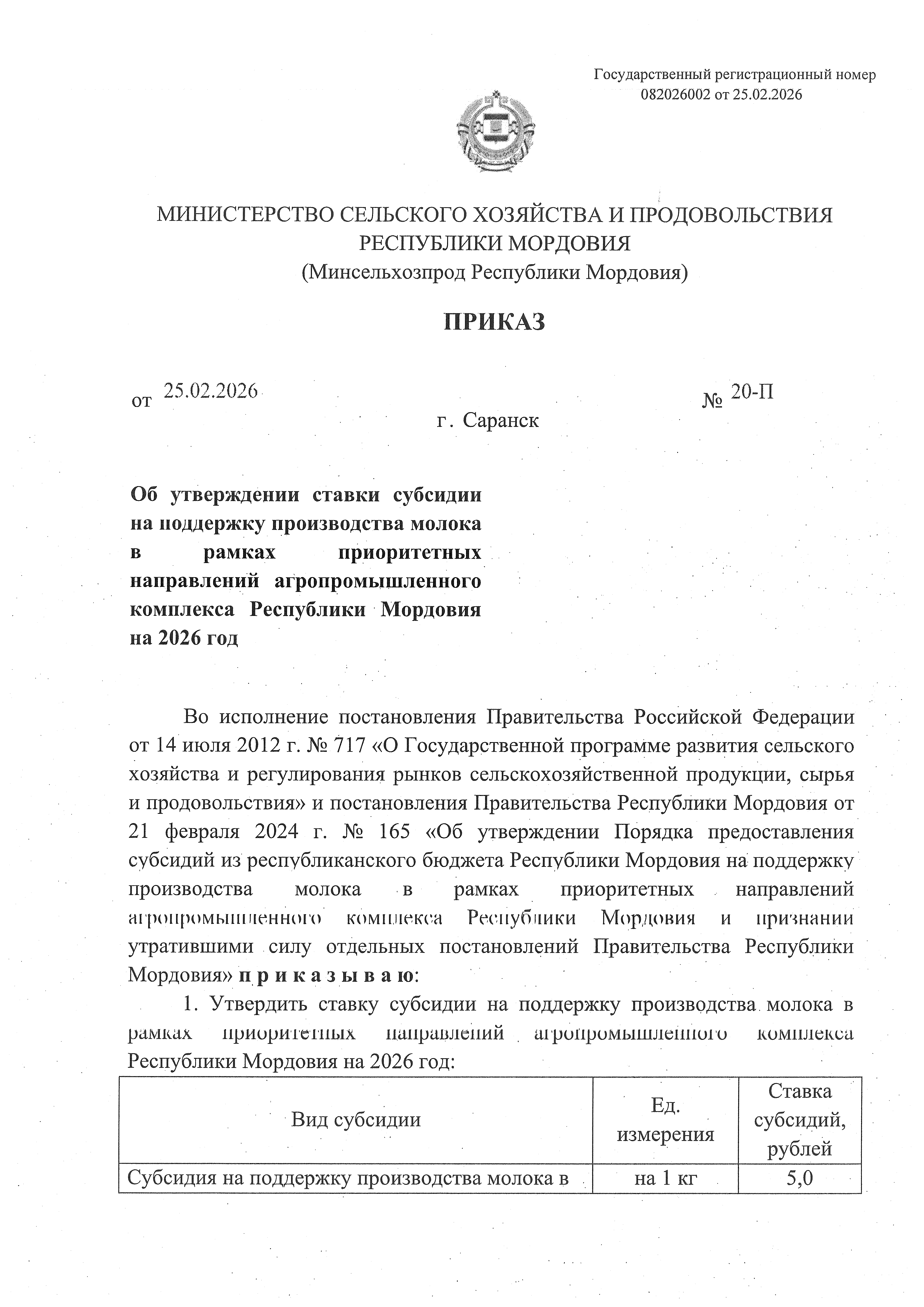 Приказ Министерства сельского хозяйства и продовольствия Республики Мордовия от 25.02.2026 № 20-П