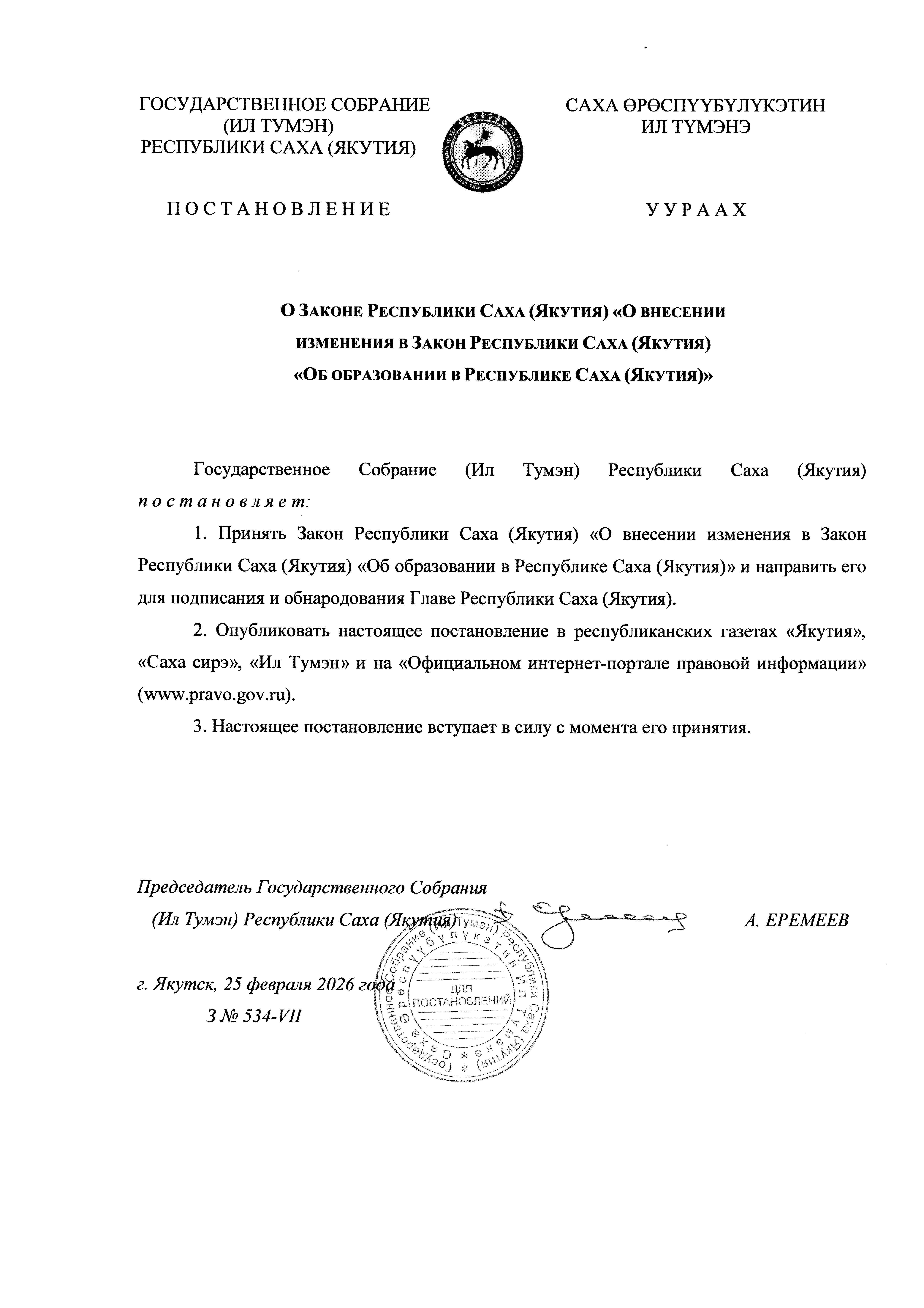 Закон Республики Саха (Якутия) от 12.03.2026 2929-З № 533-VII