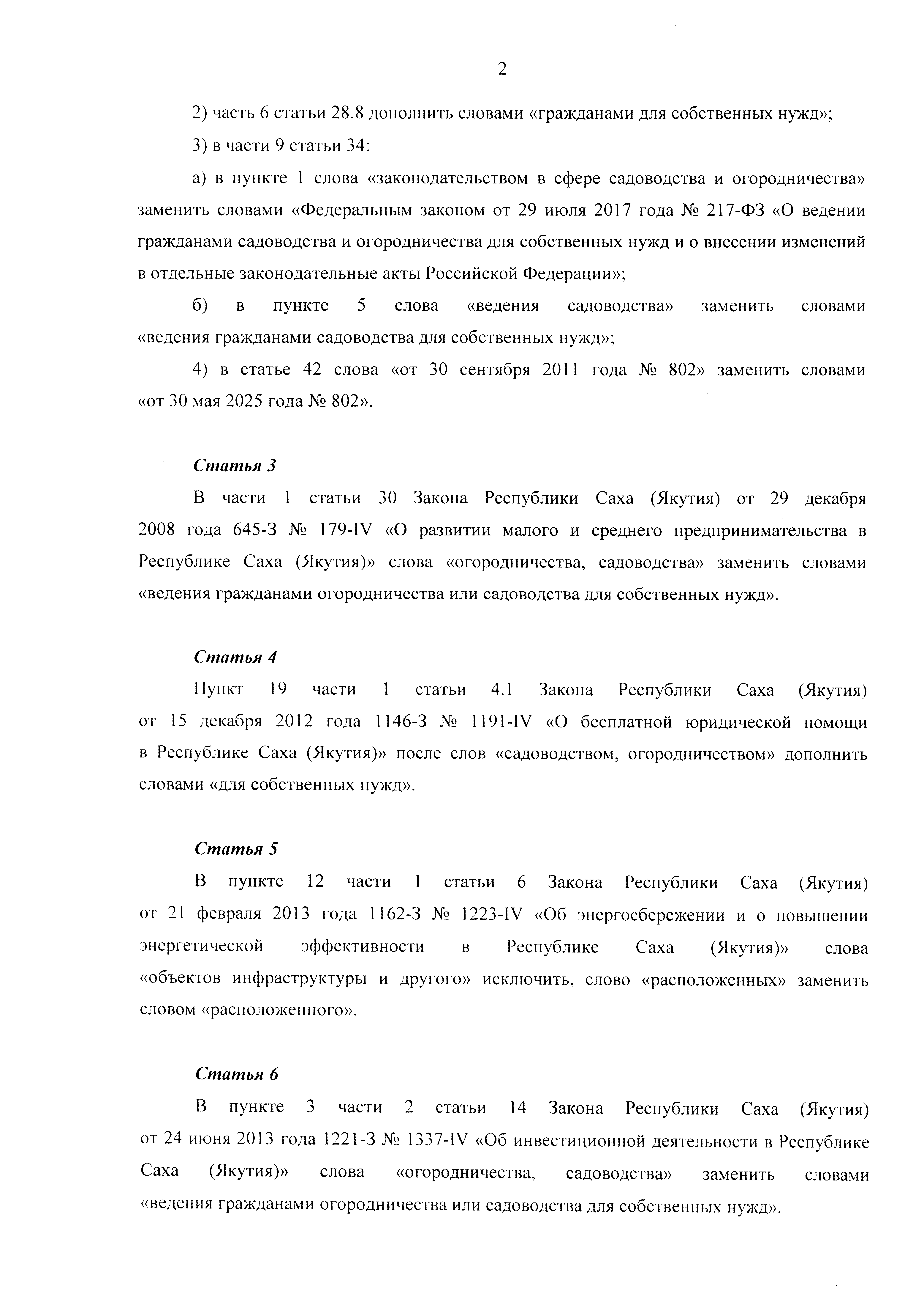 "О внесении изменений в отдельные законодательные акты Республики Саха (Якутия) по вопросам ведения гражданами садоводства и огородничества для собственных нужд"