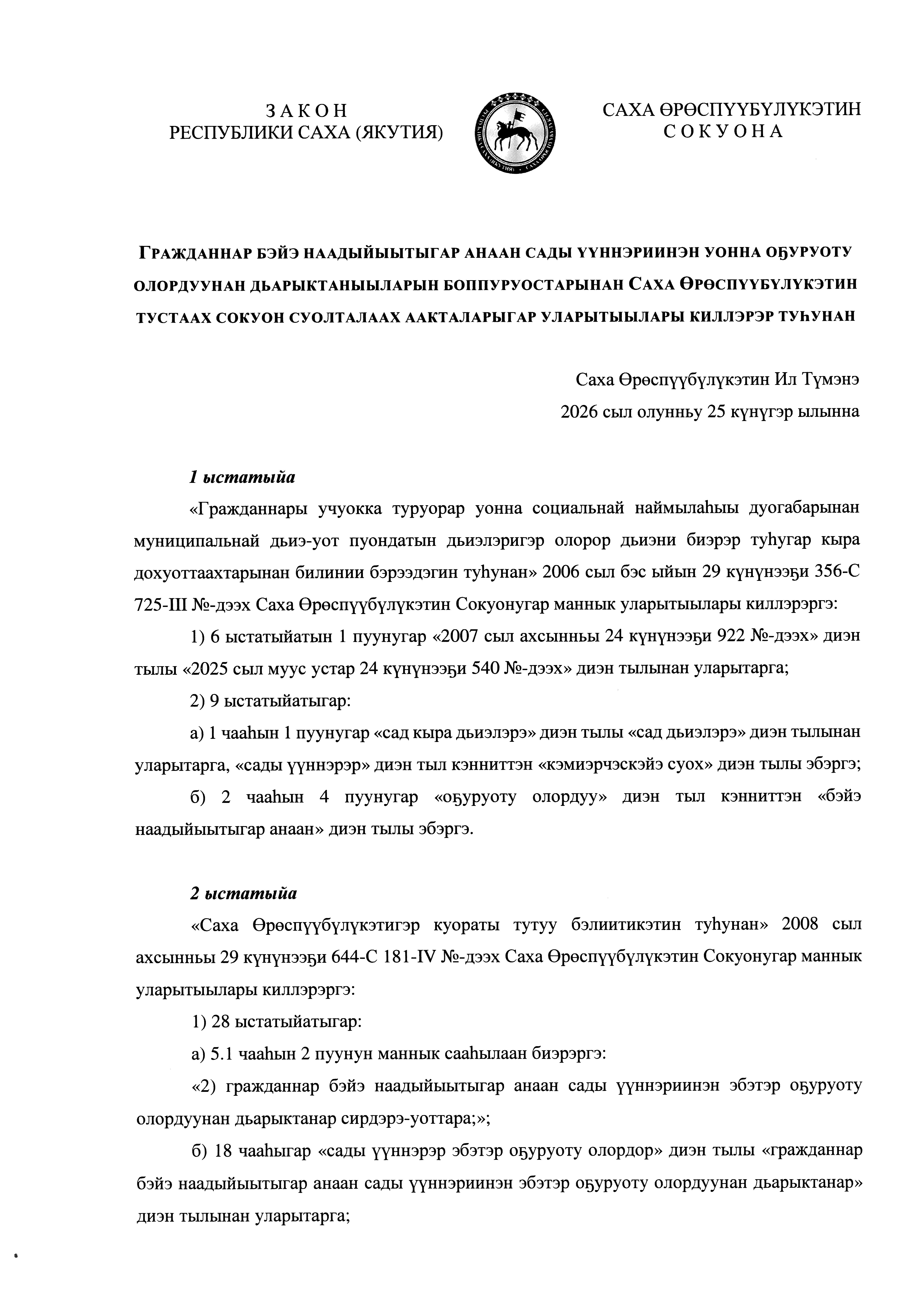 Закон Республики Саха (Якутия) от 12.03.2026 2931-З № 537-VII