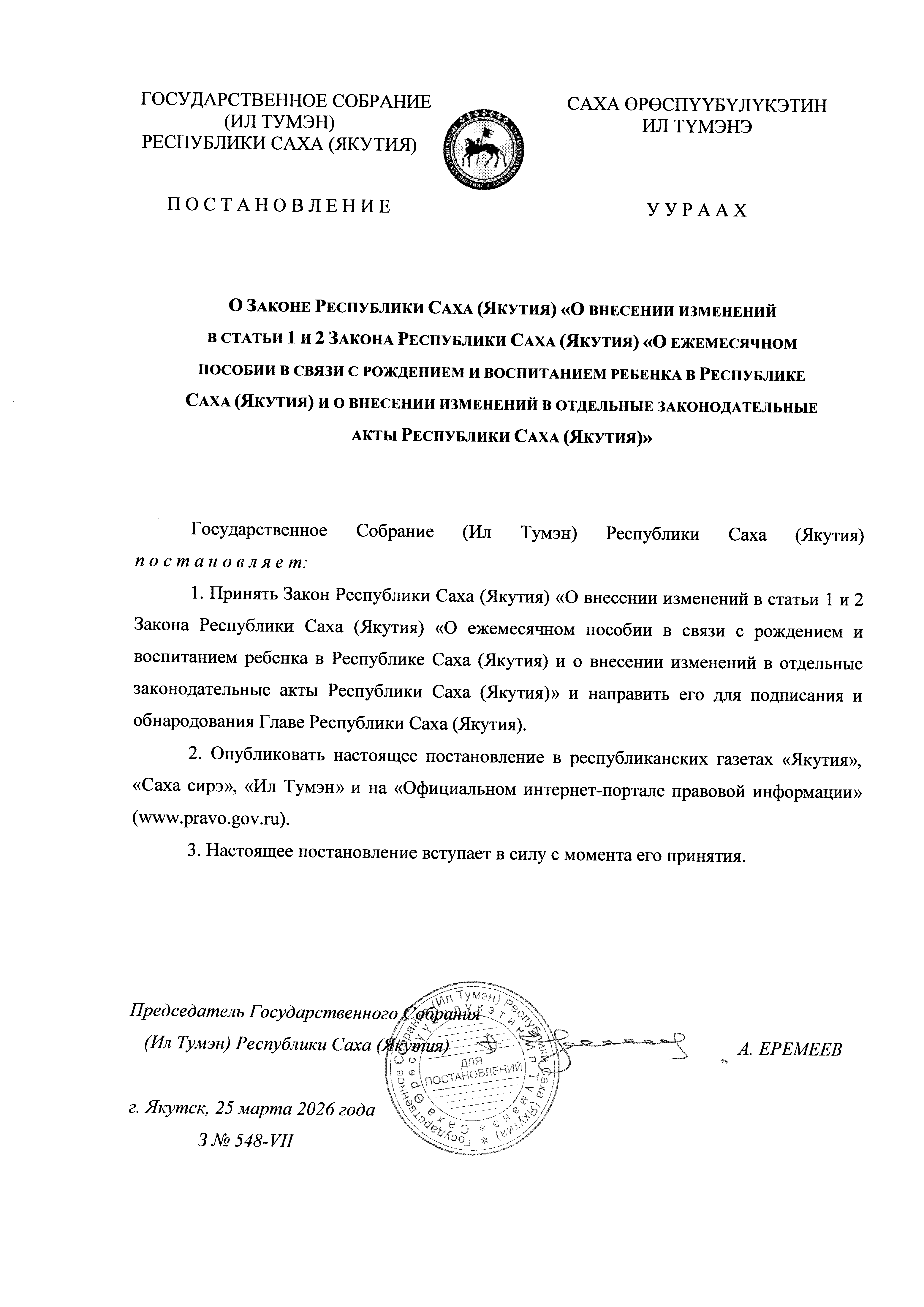 "О внесении изменений в статьи 1 и 2 Закона Республики Саха (Якутия) "О ежемесячном пособии в связи с рождением и воспитанием ребенка в Республике Саха (Якутия) и о внесении изменений в отдельные законодательные акты Республики Саха (Якутия)"