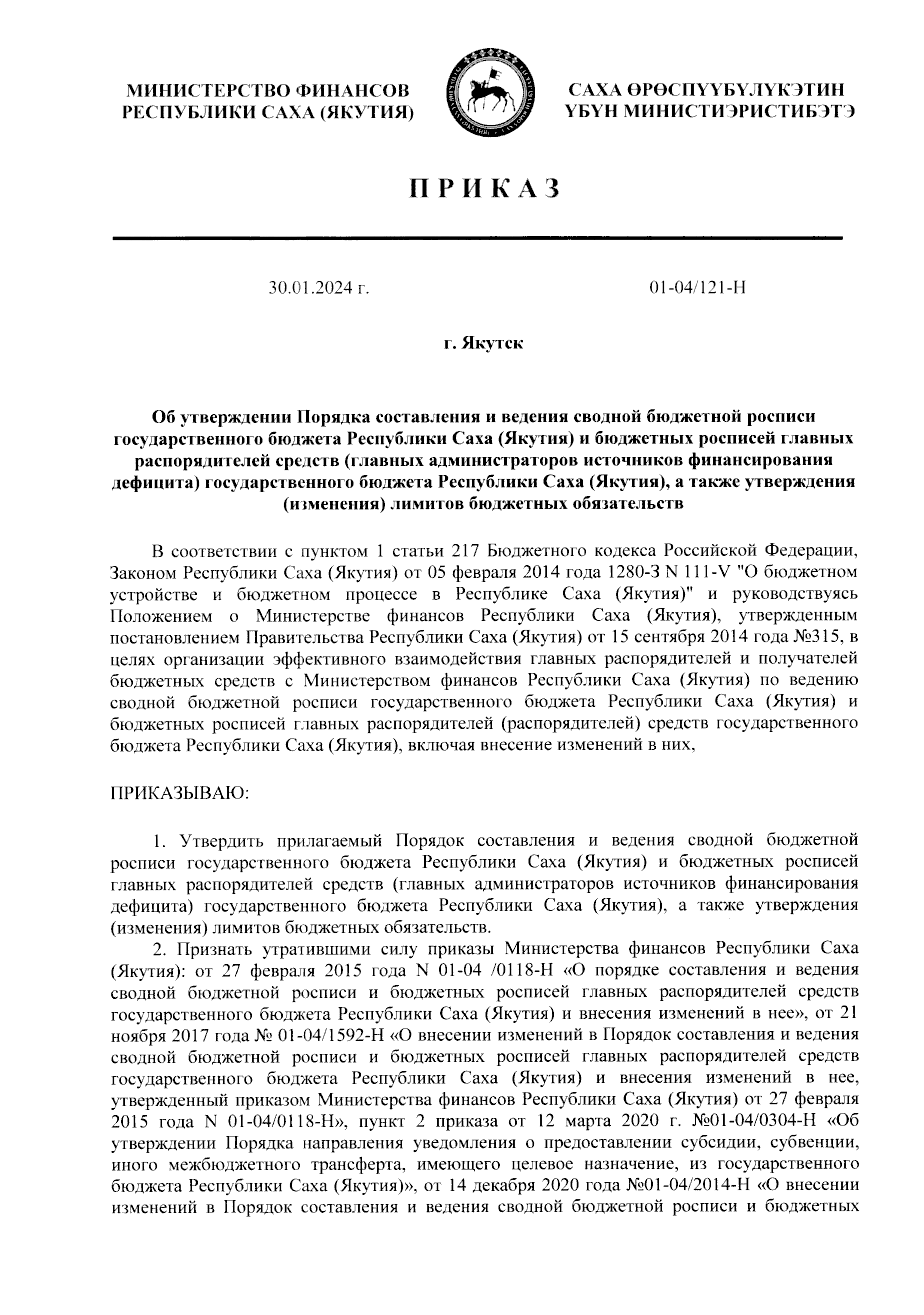 Приказ Министерства финансов Республики Саха (Якутия) от 30.01.2024 № 01-04/121-Н