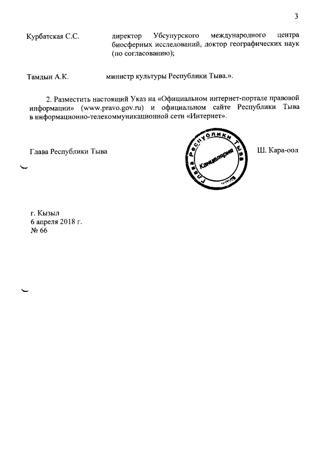Указ Главы - Председателя Правительства Республики Тыва от 06.04.2018 № 66 "О внесении изменений в Указ Главы Республики Тыва от 29 сентября 2015 года № 172"