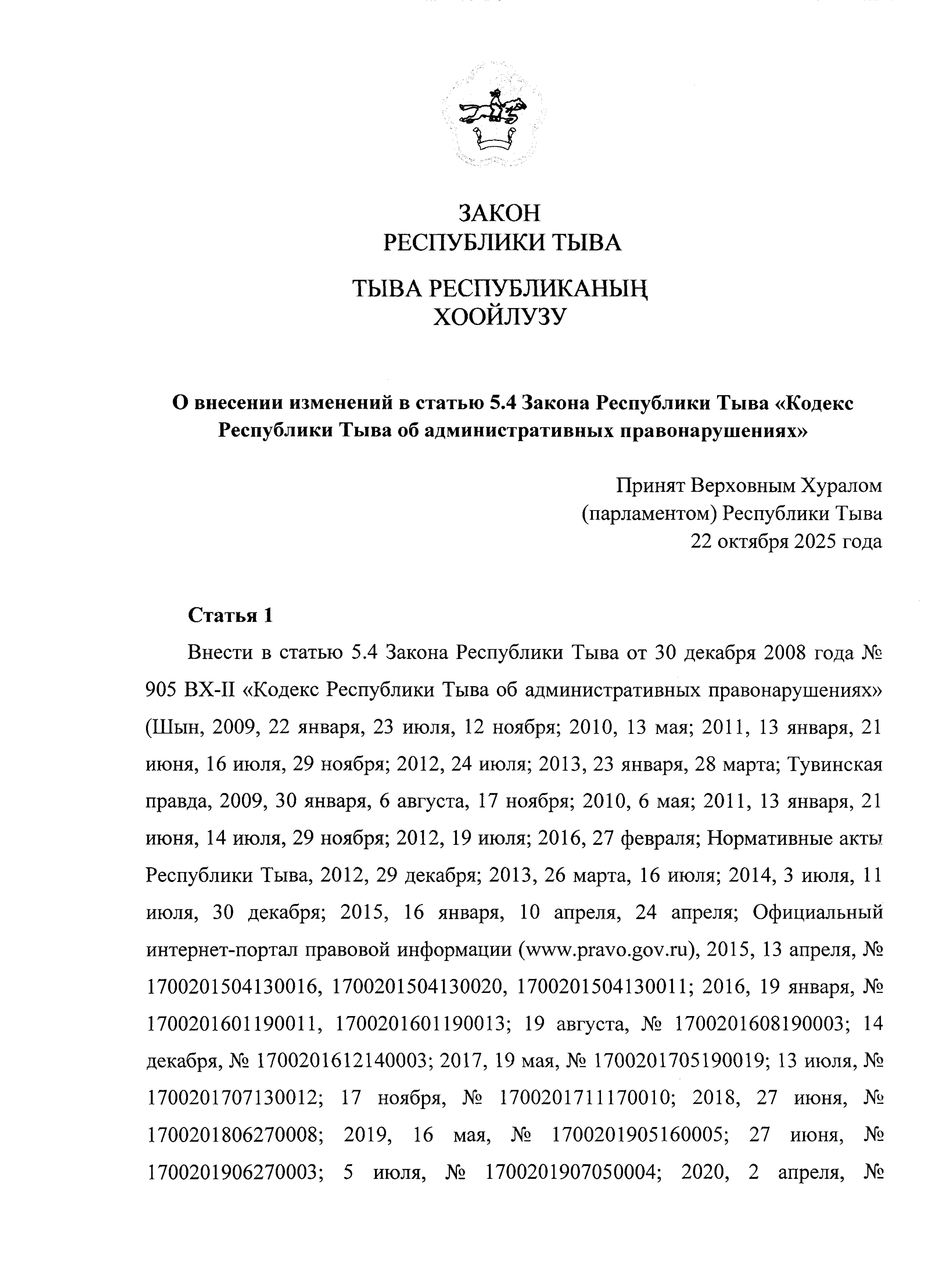 "О внесении изменений в статью 5.4 Закона Республики Тыва "Кодекс Республики Тыва об административных правонарушениях"