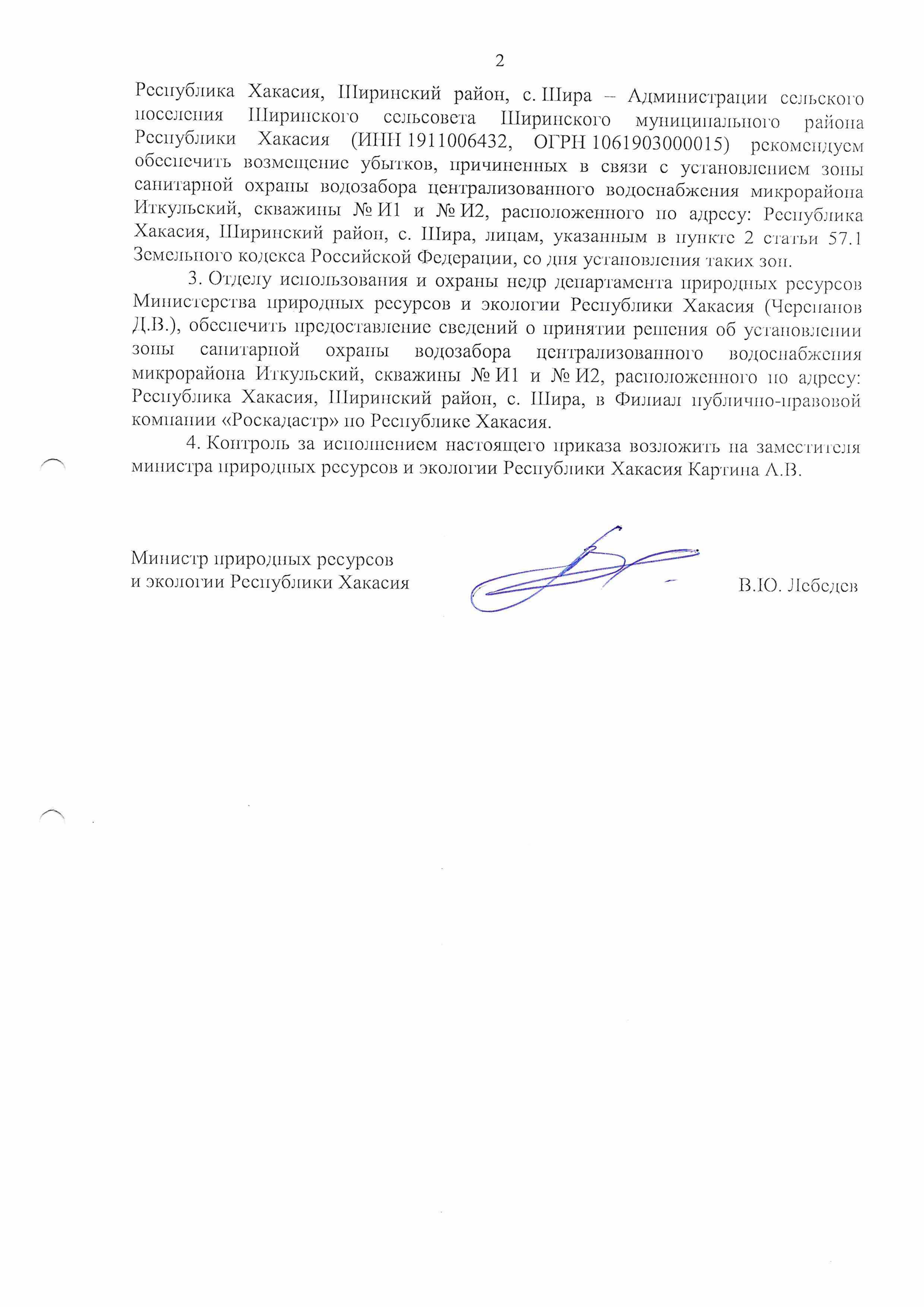 "Об установлении зоны санитарной охраны водозабора централизованного водоснабжения микрорайона Иткульский, скважины № И1 и № И2, расположенного по адресу: Республика Хакасия, Ширинский район, с. Шира"