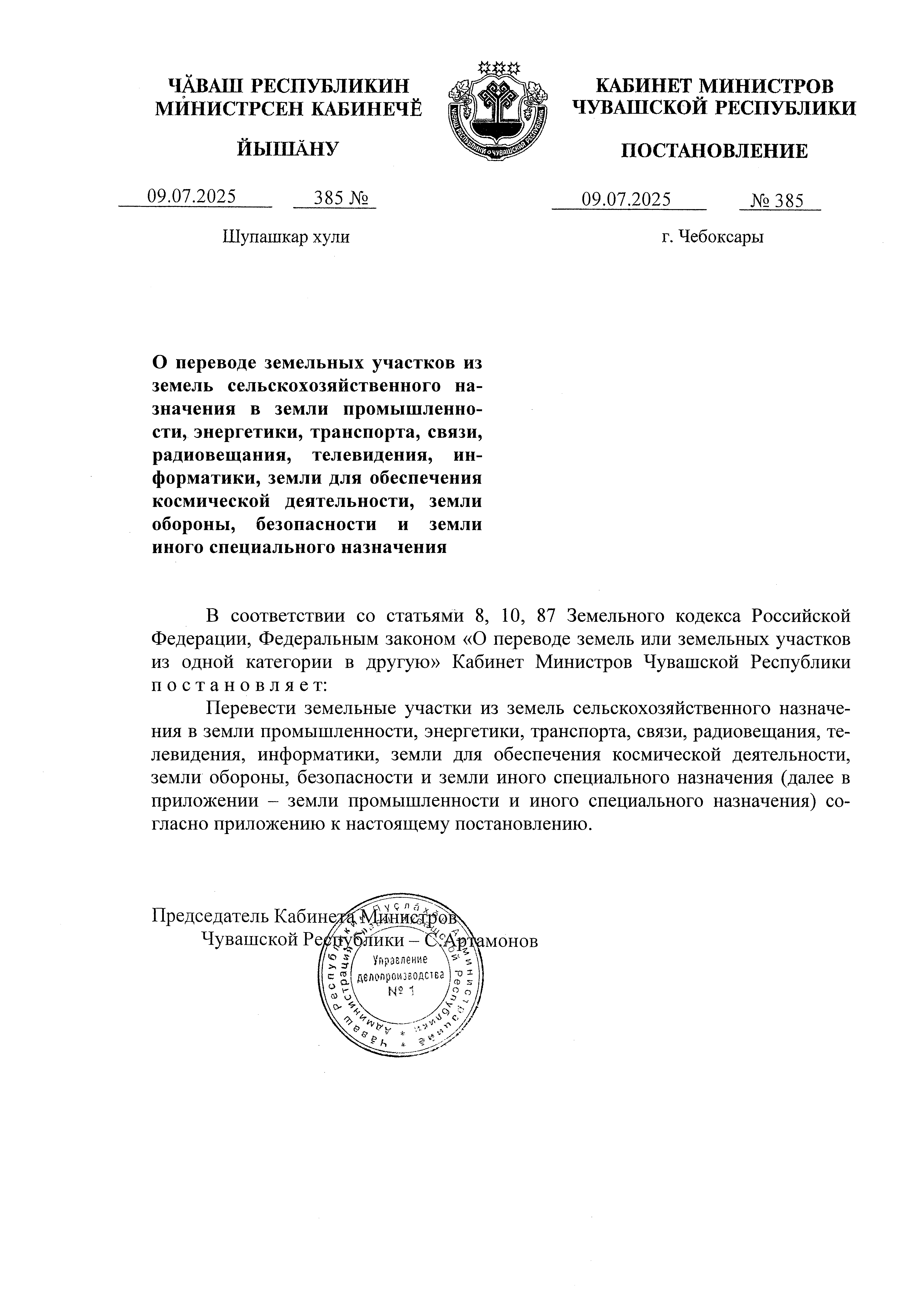 Постановление Кабинета Министров Чувашской Республики от 09.07.2025 № 385