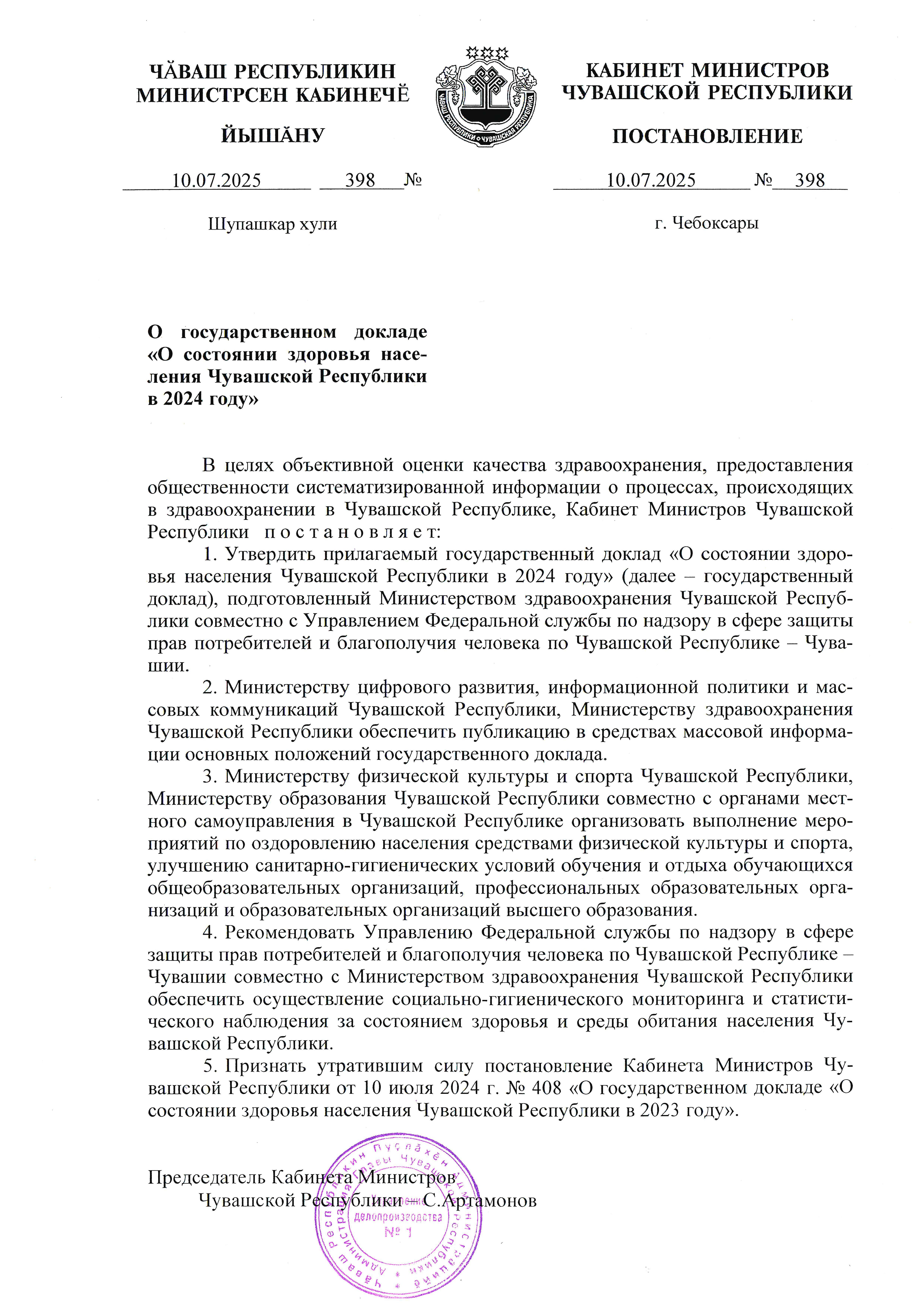 Постановление Кабинета Министров Чувашской Республики от 10.07.2025 № 398