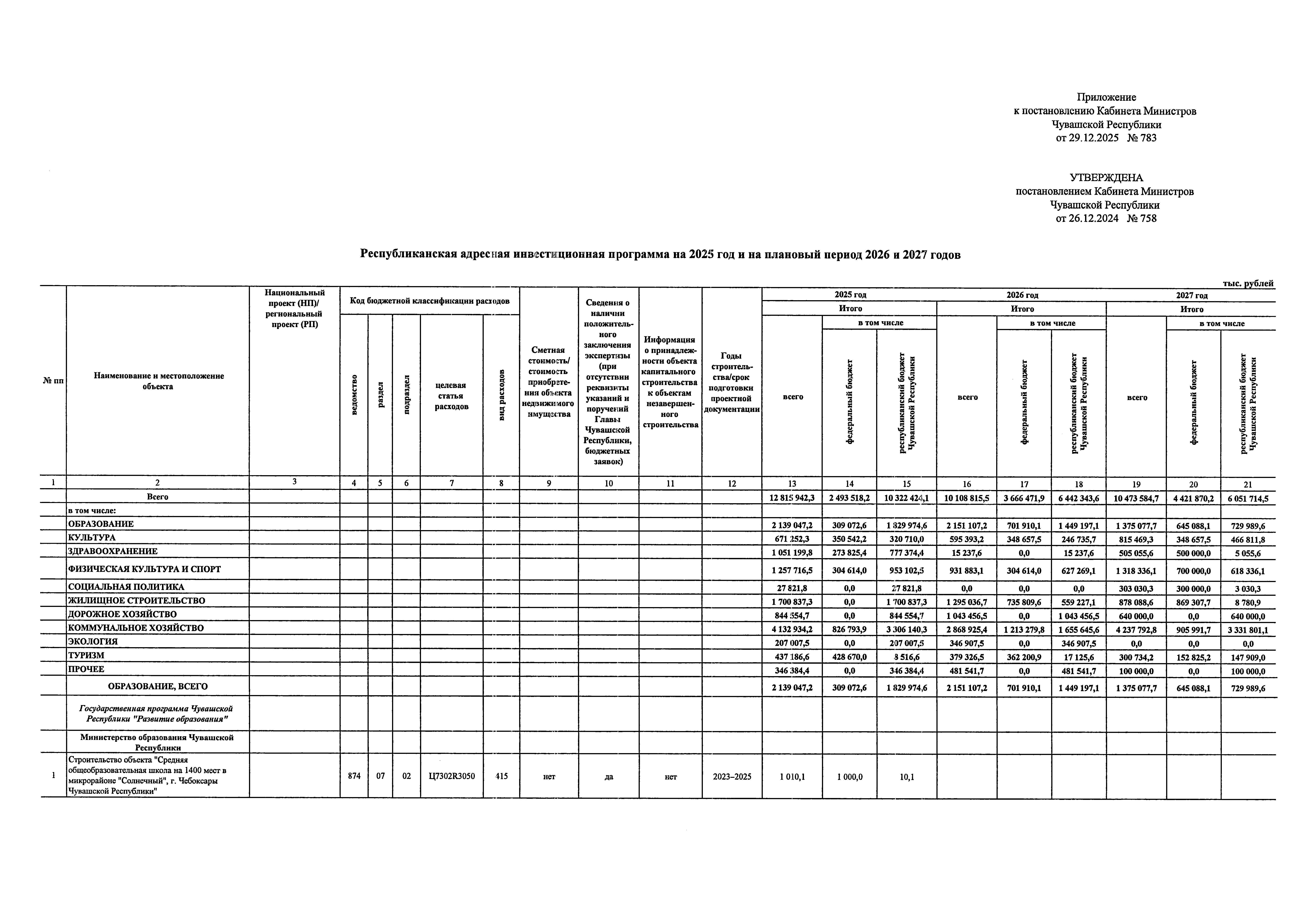 Постановление Кабинета Министров Чувашской Республики от 29.12.2025 № 783