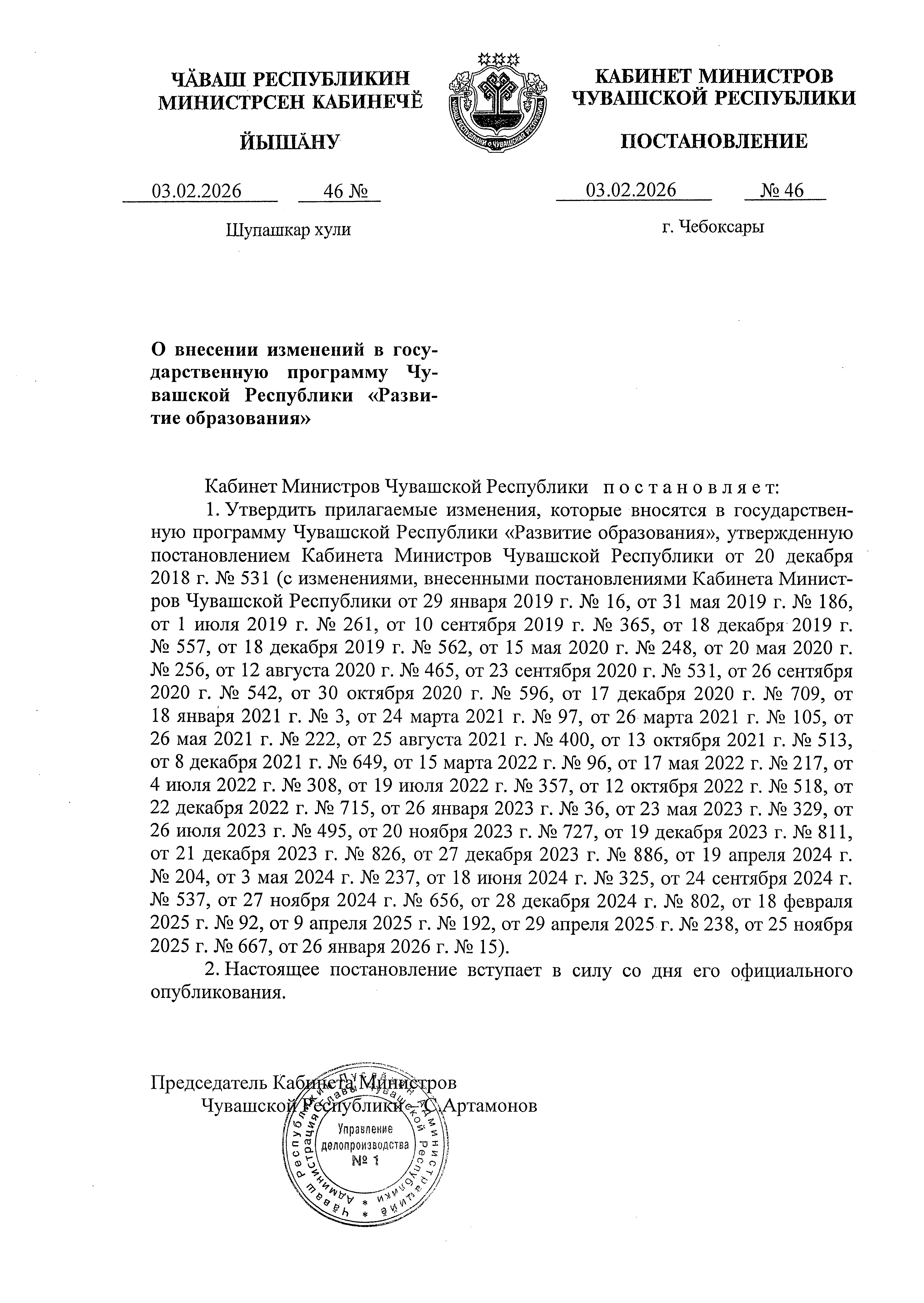 Постановление Кабинета Министров Чувашской Республики от 03.02.2026 № 46