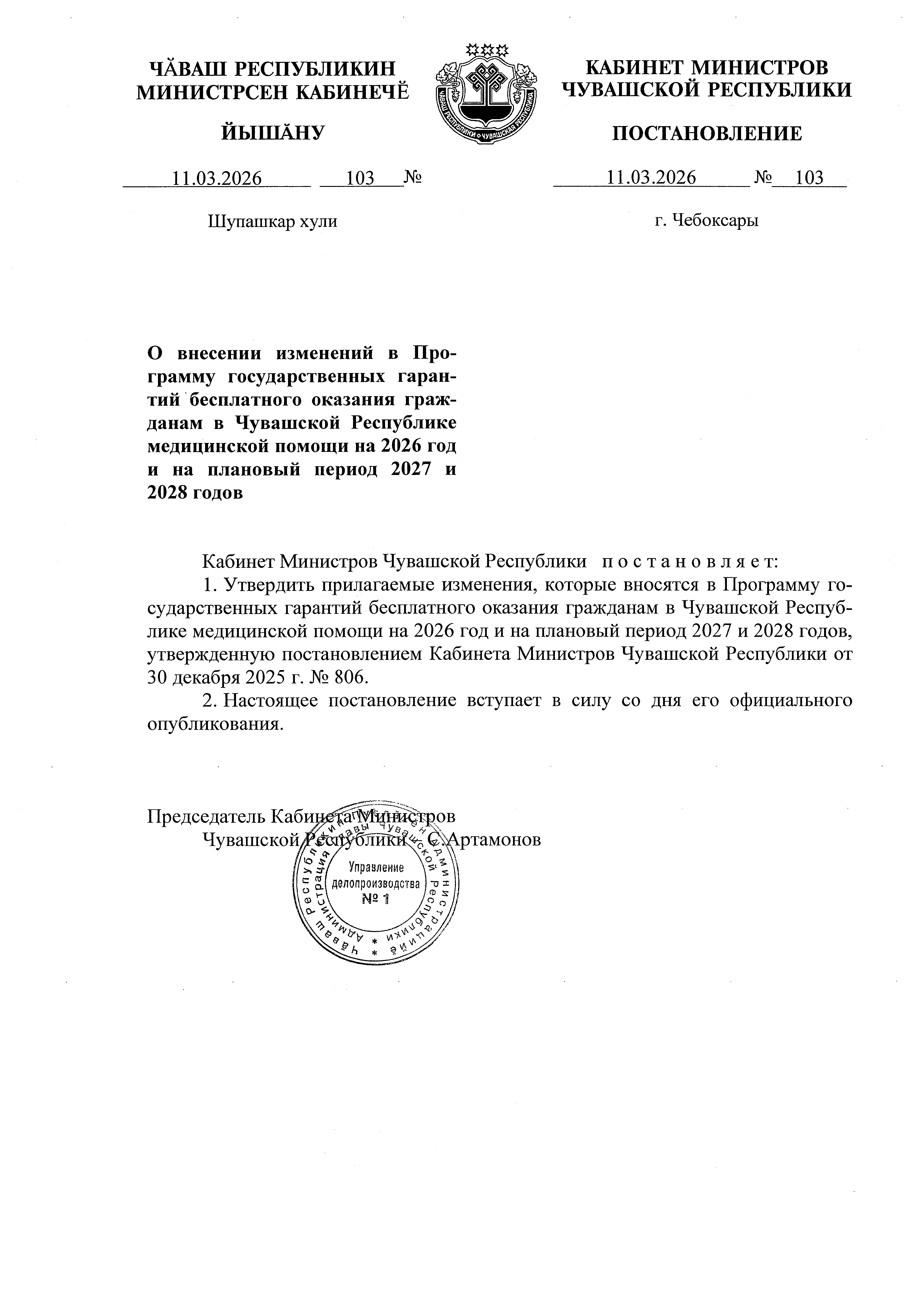 Постановление Кабинета Министров Чувашской Республики от 11.03.2026 № 103