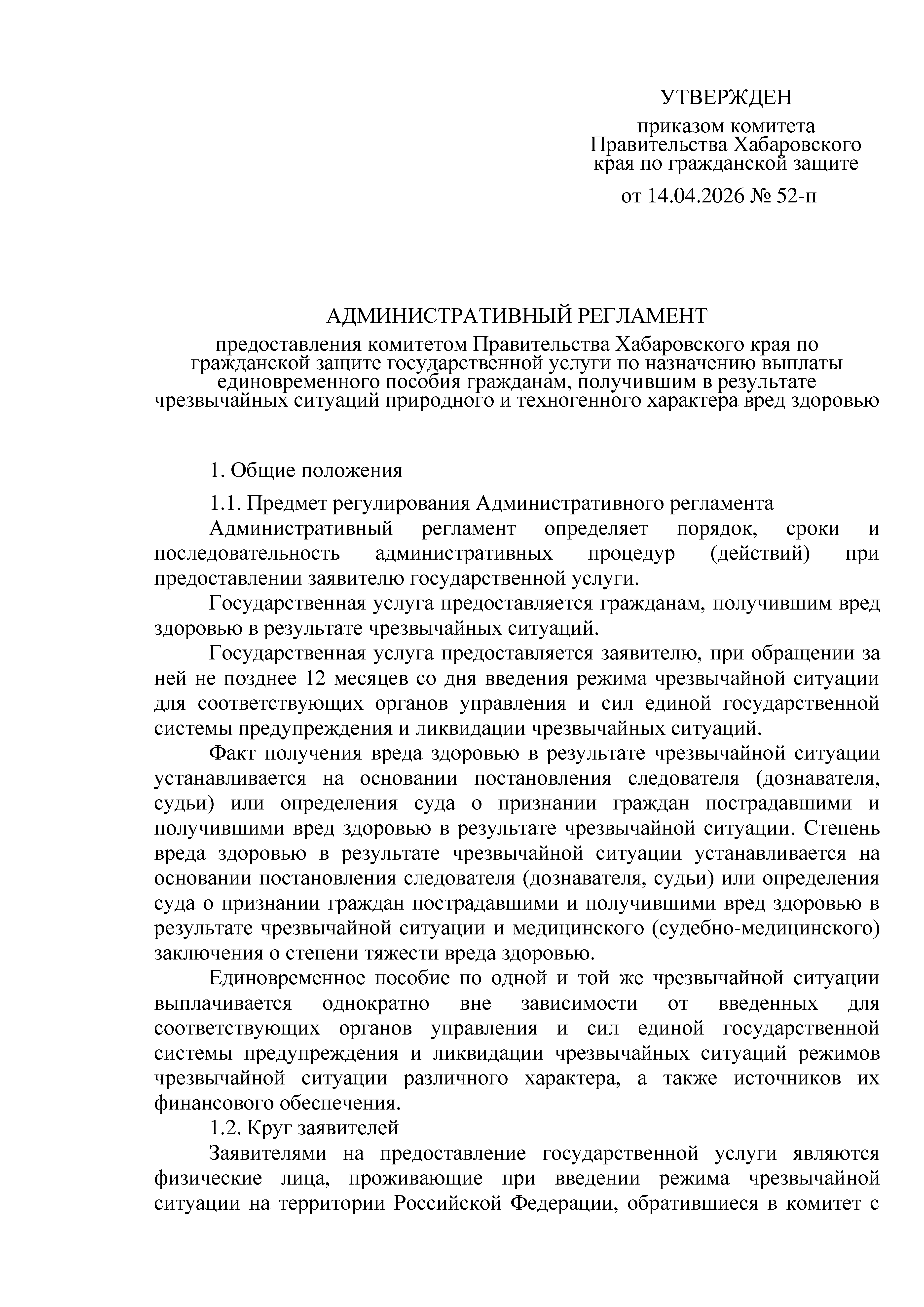 Приказ Комитета Правительства Хабаровского края по гражданской защите от 14.04.2026 № 52-п