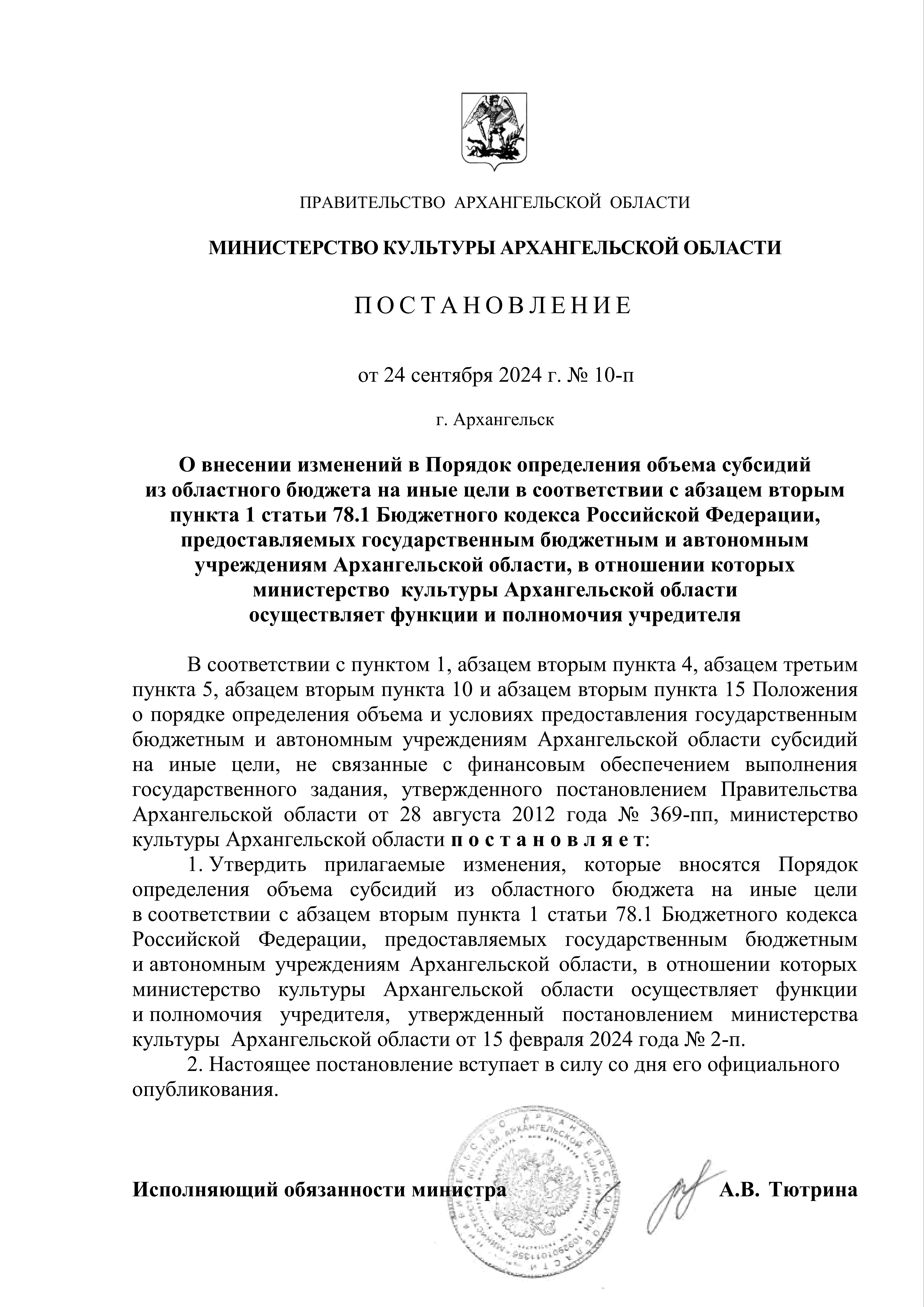 Постановление Министерства культуры Архангельской области от 24.09.2024 № 10-п