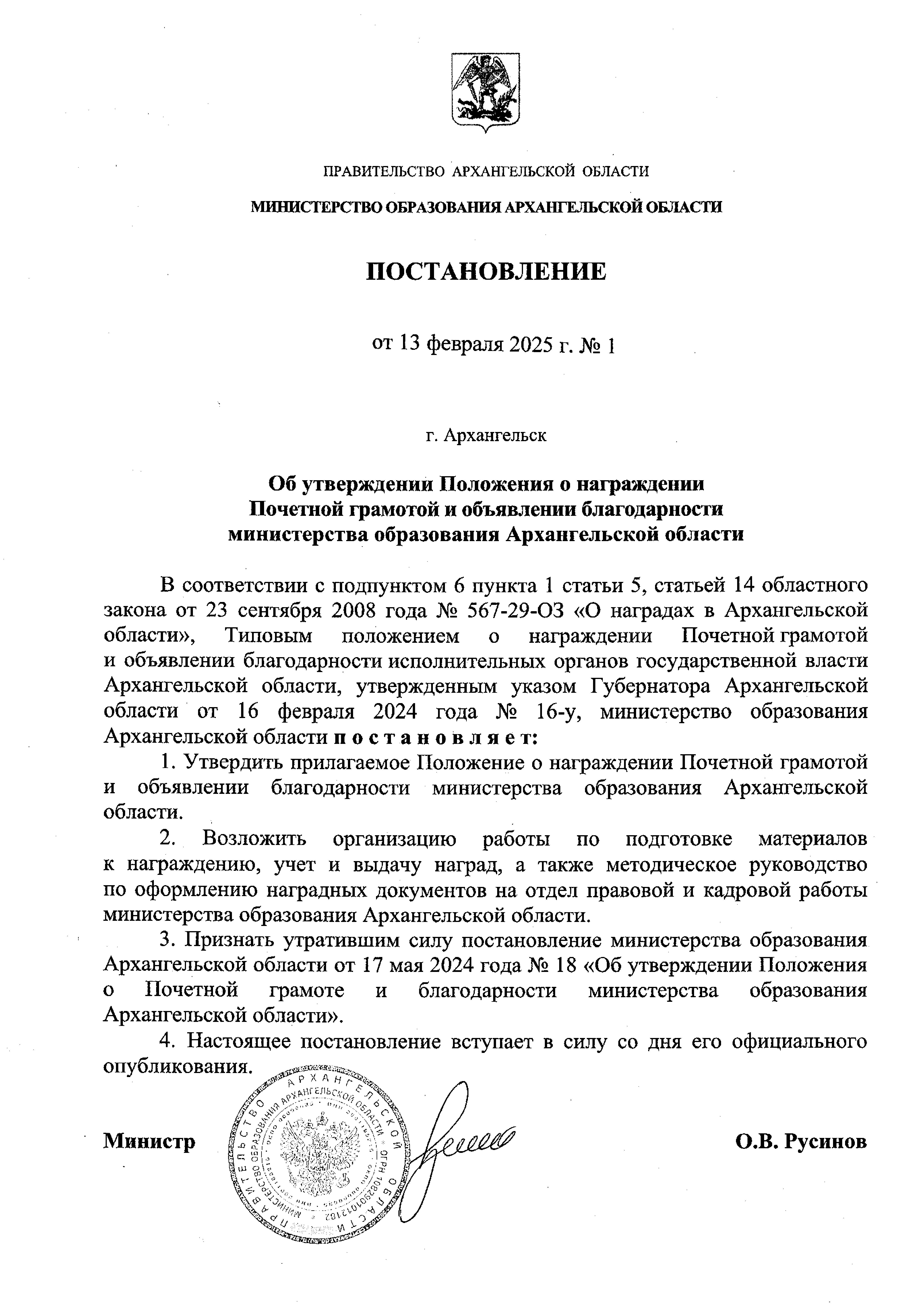Постановление Министерства образования Архангельской области от 13.02.2025 № 1