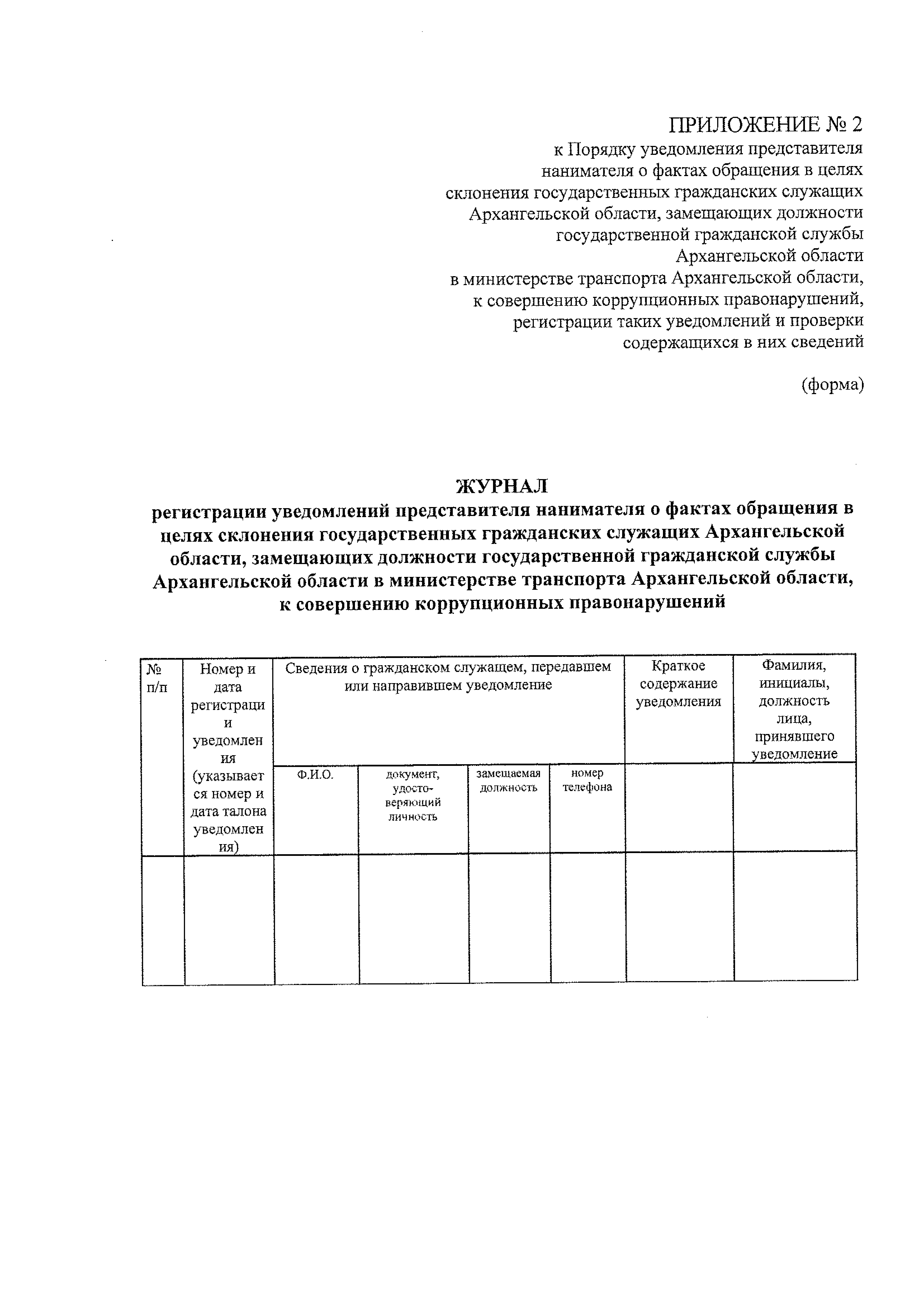 "Об утверждении Порядка уведомления представителя нанимателя о фактах обращения в целях склонения государственных гражданских служащих Архангельской области, замещающих должности государственной гражданской службы Архангельской области в министерстве транспорта Архангельской области, к совершению коррупционных правонарушений, регистрации таких уведомлений и проверки содержащихся в них сведений"