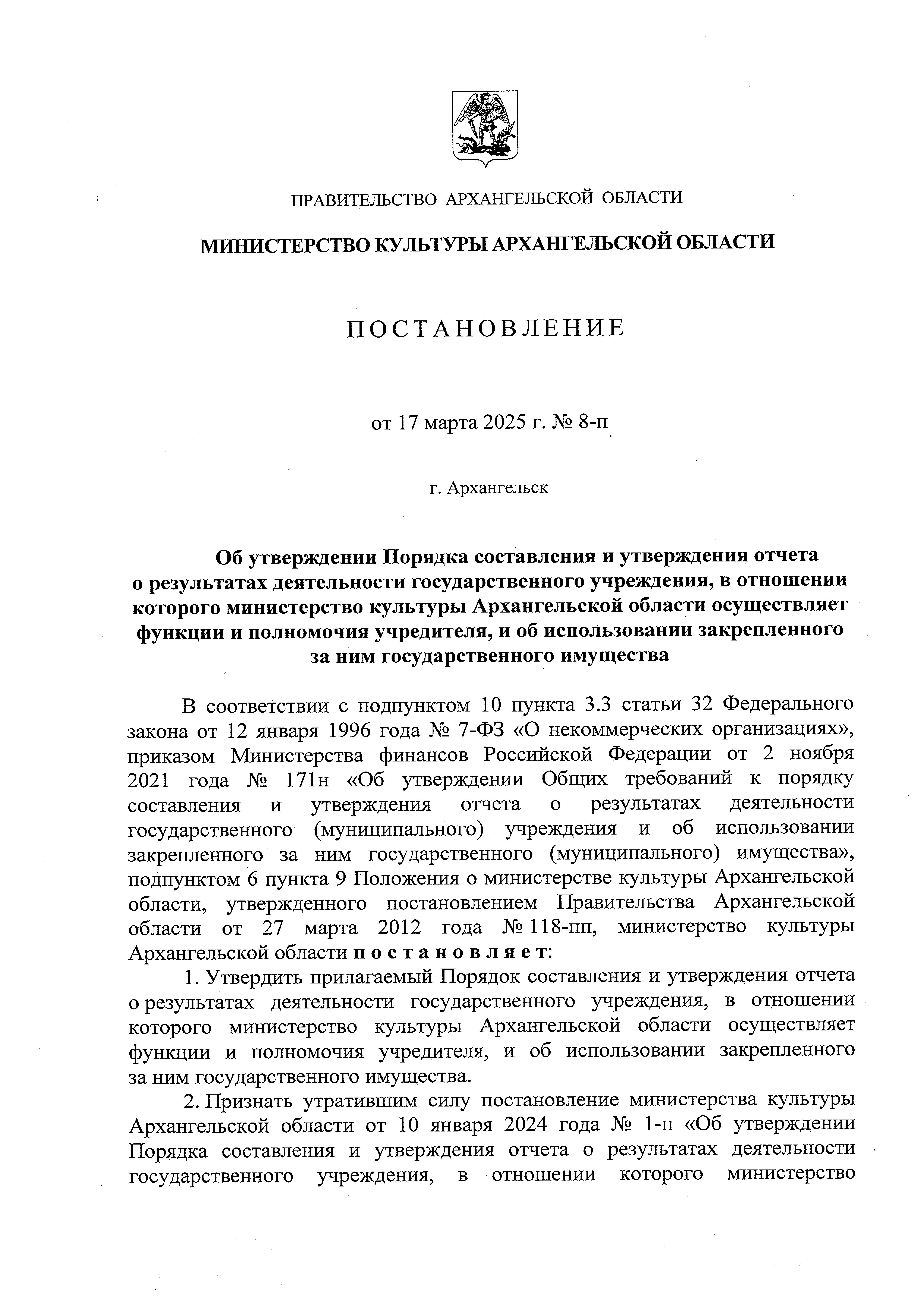 Постановление Министерства культуры Архангельской области от 17.03.2025 № 8-п