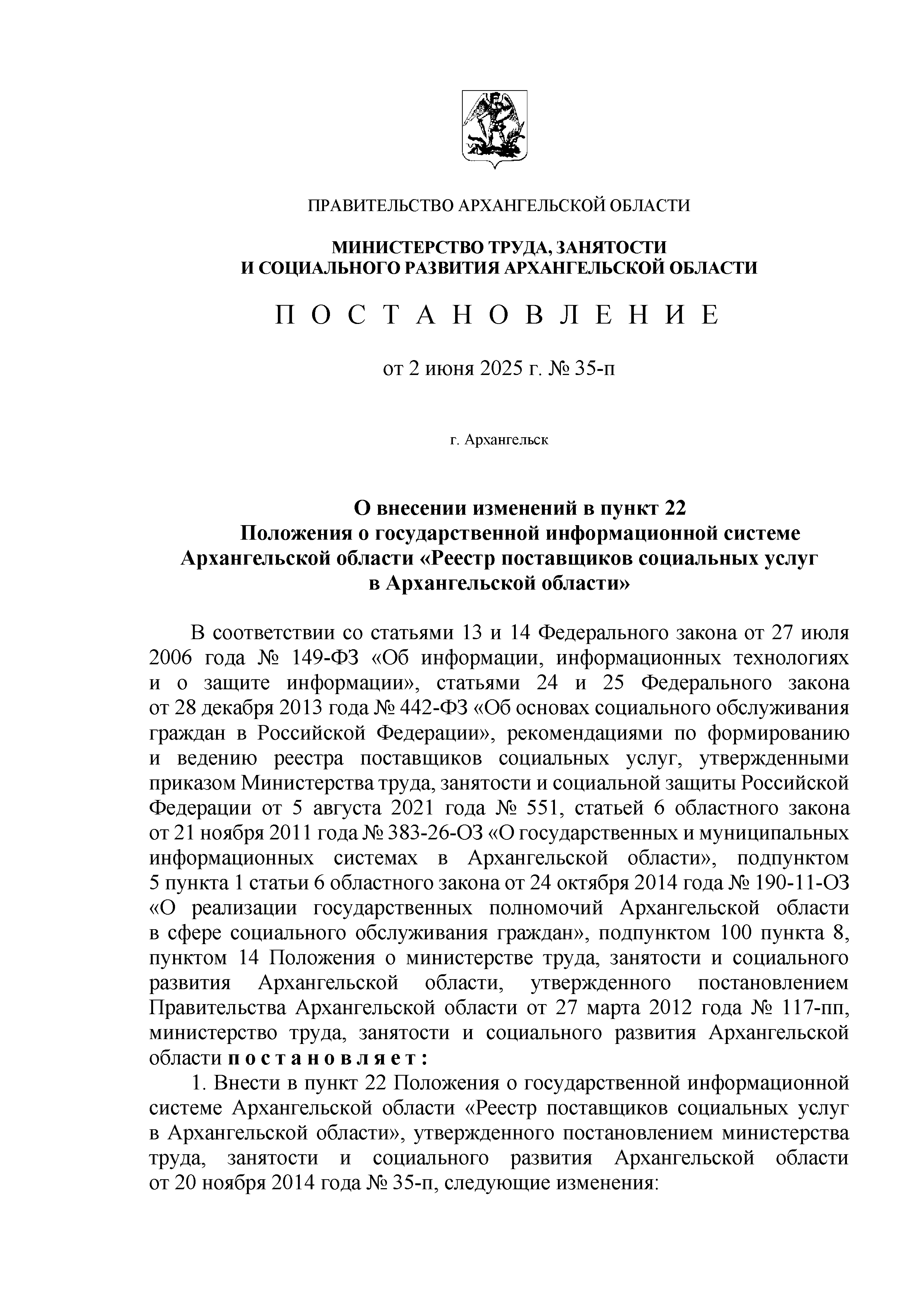 Постановление Министерства труда, занятости и социального развития Архангельской области от 02.06.2025 № 35-п