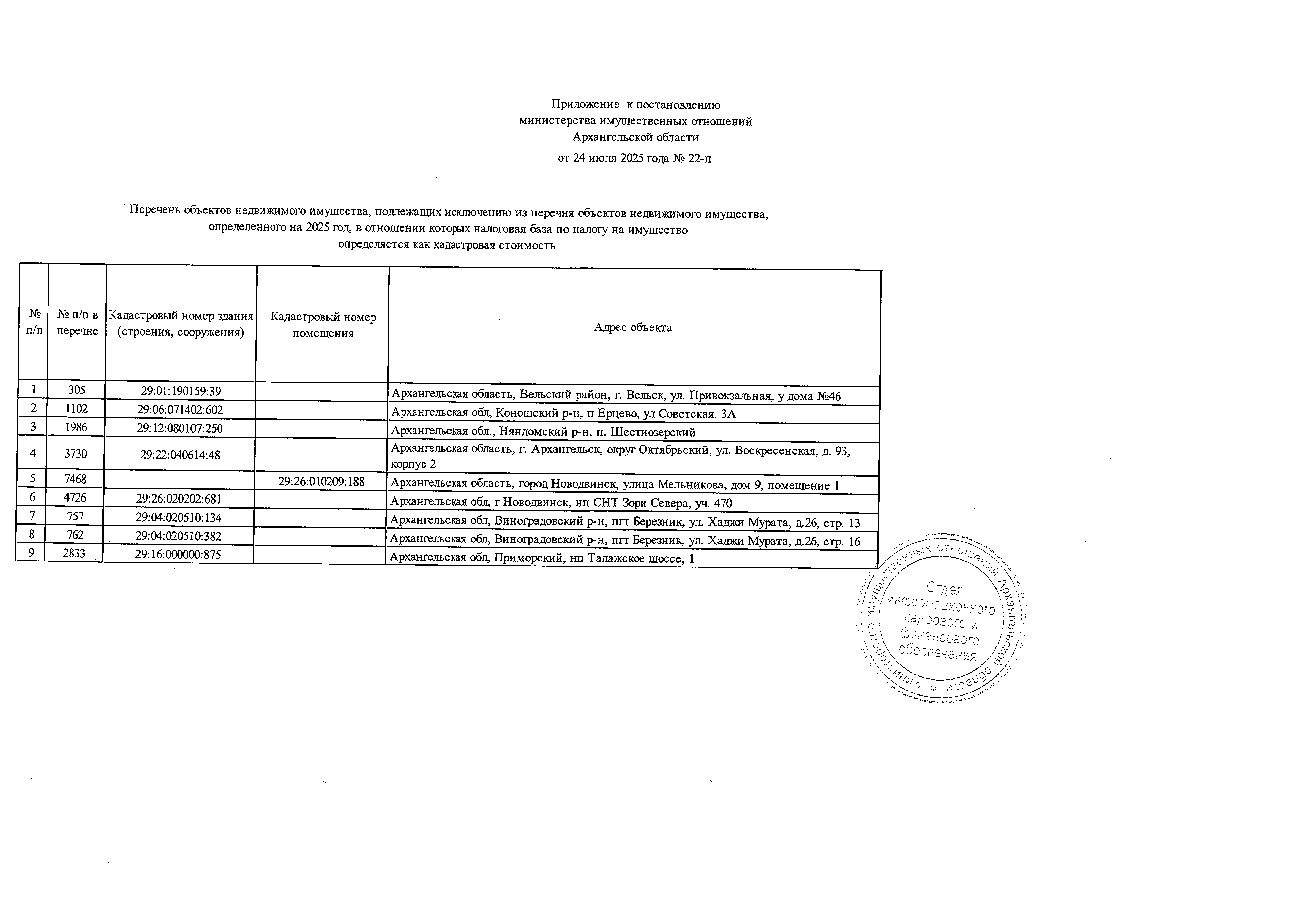 Постановление Министерства имущественных отношений Архангельской области от 24.07.2025 № 22-п