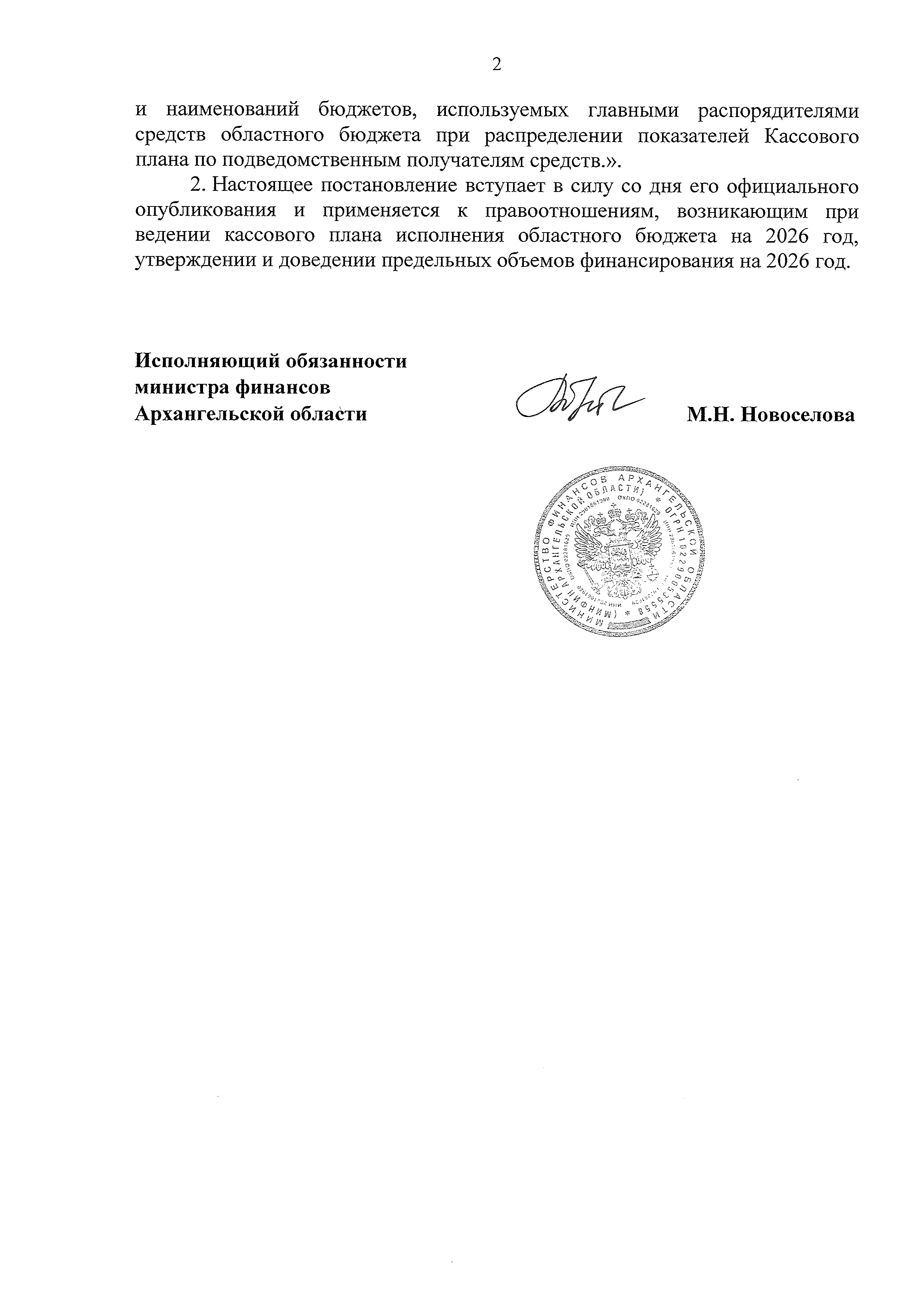 "О внесении изменения в пункт 2 постановления министерства финансов Архангельской области от 05 февраля 2026 года № 3-пф"