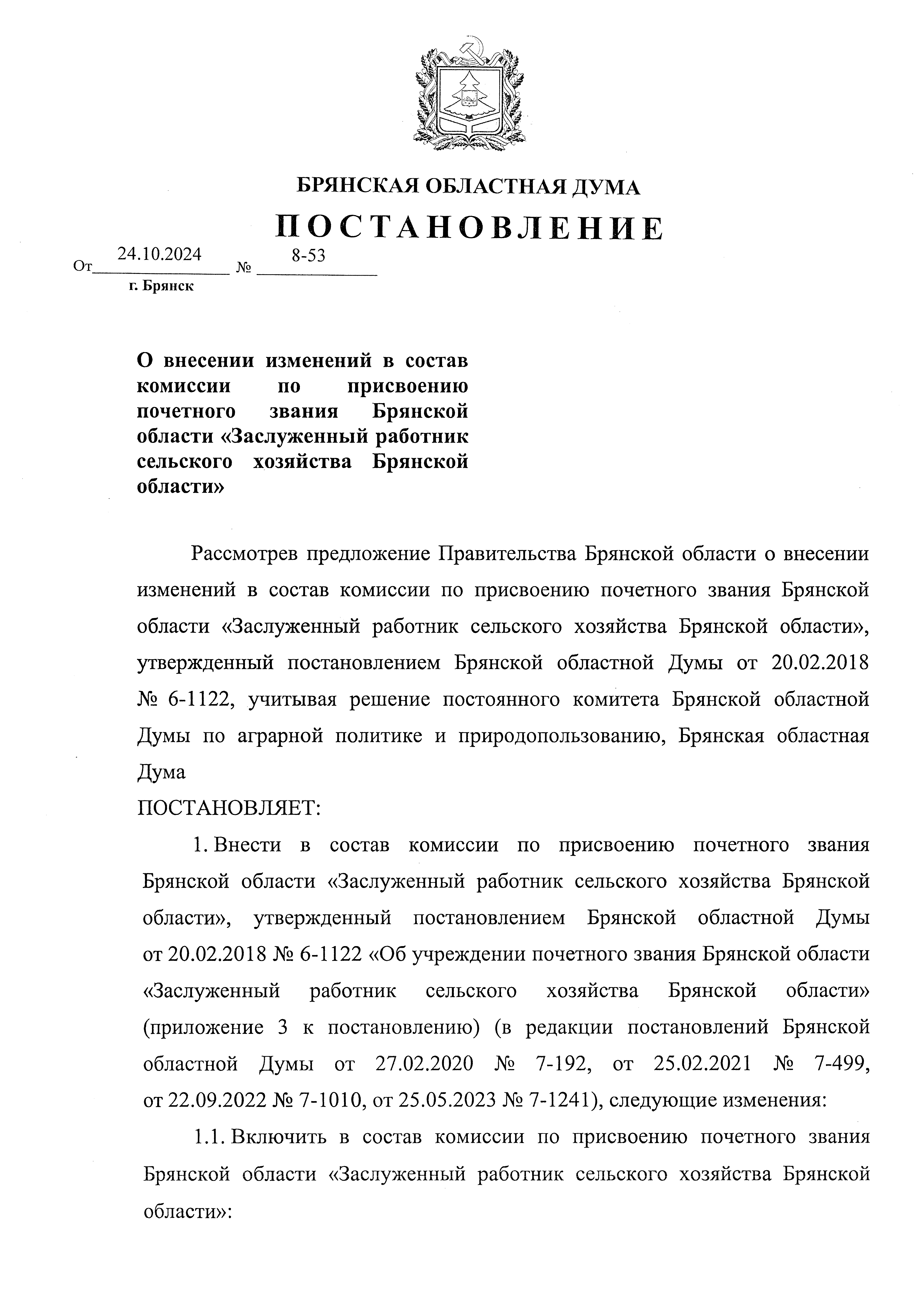 Постановление Брянской областной Думы от 24.10.2024 № 8-53