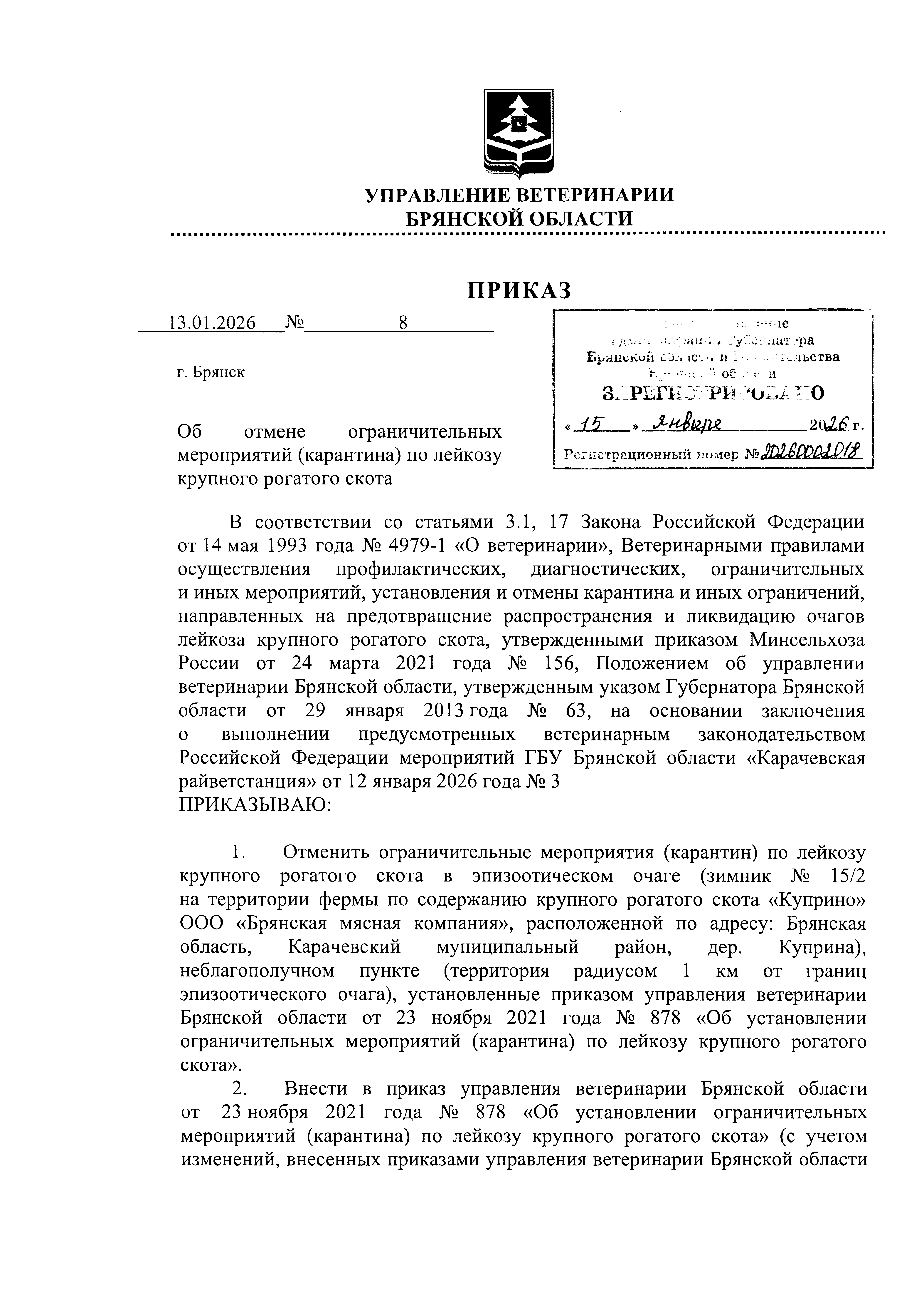 Приказ Управления ветеринарии Брянской области от 13.01.2026 № 8